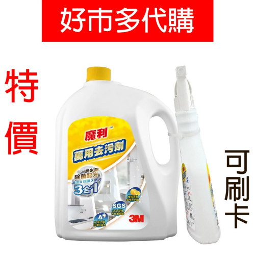 店到家宅配 - 標準包裹:一次限2組 📌注意事項: ■【正品】商品下標後-才至『好市多』店內購入,效期都是賣場最新 ■【缺貨】若好市多缺貨商品會『聊聊』通知買家,下單後請留意『聊聊』通知 ■【超重超長限制】蝦皮店/超商均有限重5公斤/單邊長45公分內,總長105公分內限制,若超重及超長,請選『店到家宅配 - 大型包裹』或聊聊詢問 ■【其他好市多商品】若有其他想購買的好市多商品,但賣場沒上架,可聊聊詢問 品名3M 魔利 奈米銅配方萬用去污劑 500毫升 + 補充瓶3785毫升 香味柑橘香 內容量/入數噴槍500毫升 + 補充瓶3785毫升 商品重量4.7公斤 商品尺寸長 28公分 X 寬 13.1公分 X 高 27.5公分 商品介紹: A+防污膜:打掃後形成親水性高分子防污膜,讓污垢細菌不易再附著,打掃更輕鬆、省力 用途廣:適合客廳、廚房、浴室各種汙垢,包含灰塵、油垢、口紅、蠟筆、奇異筆、原子筆、茶漬、咖啡漬、煙燻痕跡等 經第三方單位檢測,針對金黃色葡萄球菌、大腸桿菌、克雷白氏肺炎菌具抗菌效果 效力強又超省力 成分水、特殊界面活性劑、二乙醇胺、奈米銅商品用途多功能清潔使用方式均勻噴灑於物體表面靜待片刻,配合清潔布或菜瓜布擦拭即可。 注意事項1.若欲使用在不明確材質之物品時,請先在不明顯處小範圍擦拭,確認無褪色情形發生再大面積使用。 2.使用時請保持空氣流通。 3.肌膚敏感者長時間使用請戴手套。 4.不建議使用在食品容器內部。 5.請放置於兒童寵物無法取得處。