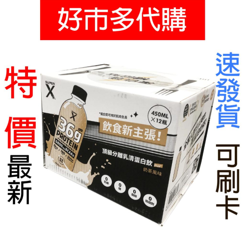 一單限購一箱 ※單箱原箱寄出,併購額外裝箱寄出 📌注意事項: ■【正品】商品下標後-才至『好市多』店內購入,效期都是賣場最新 ■⛔️【缺貨】⛔️若好市多缺貨商品會『聊聊』通知買家取 消訂單,下單後請務必留意「聊聊」訊息 ■【超重超長限制】蝦皮店/超商均有限重5公斤/單邊長45公分內,總長105公分內限制,若超重及超長,請選『店到家宅配 - 大型包裹』或聊聊詢問 ■【其他好市多商品】若有其他想購買的好市多商品,但賣場沒上架,可聊聊詢問 品名: Super X 頂級分離乳清蛋白飲 Plus 奶茶風味 450毫升 X 12入 X 1箱 內容量/入數: 450毫升 X 12入 X 1箱 商品重量12.26公斤 商品尺寸: 長 39.8公分 X 寬 26.4公分 X 高 19公分 成分: 水、美國分離乳清蛋白(分離乳清蛋白、大豆卵磷脂)、胺基乙酸(甘胺酸)、紐西蘭全脂奶粉、奶香金萱茶(金萱紅茶濃縮萃取液(水、金萱紅茶葉)、美國分離乳清蛋白(分離乳清蛋白、大豆卵磷脂))、香料、紅茶萃取、綠茶萃取、甜菊醣苷(甜味劑)、維生素E(抗氧化劑) 商品用途: 補充蛋白質、健身運動族群 使用方式: 飲用 商品介紹: 不添加防腐劑、增稠劑、抗結劑等人工添加物 每瓶含36G優質蛋白質及6800mg BCAAS 常溫即可保存RTD高蛋白奶茶。 每瓶熱量180大卡 食品業登錄字號A-127528961-00000-8 產品責任險契約字號0960-2236015667-00 注意事項: 1.本品補充多種人體所需營養素,可調節身體機能。 2.支鏈有機酸尿症(例如楓糖尿症)患者應避免食用。 3.咖啡因含量20mg/100mL以下。 4.含高濃度乳清蛋白,牛乳懸浮物或沉澱屬於正常現象,請安心飲用。搖晃均勻後飲用,風味更佳。 5.奶素。 本產品已投保產品責任險5000萬元(投保金額不等同於理賠金額)。 過敏原: 本產品含奶類、大豆及其製品。 蛋白分類: 分離乳清