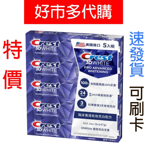 ※「7-11全家免運」取付>>賣場小編 📌注意事項: ■【正品】商品下標後-才至『好市多』店內購入,效期都是賣場最新 ■⛔️【缺貨】⛔️若好市多缺貨商品會『聊聊』通知買家取 消訂單,下單後請務必留意「聊聊」訊息 ■【超重超長限制】蝦皮店/超商均有限重5公斤/單邊長45公分內,總長105公分內限制,若超重及超長,請選『店到家宅配 - 大型包裹』或聊聊詢問 ■【其他好市多商品】若有其他想購買的好市多商品,但賣場沒上架,可聊聊詢問 品名:Crest 3D White 速效亮白牙膏 147公克 X 5入 內容量/入數:147公克 X 5入 商品容量: 147公克 商品重量: 0.08公斤 商品尺寸: 寬 22.3公分 X 深 3.7公分 X 高 25.2公分 商品敍述: 搭配正確刷牙習慣,能有效防止牙齒染色,達到防漬效果 成分: glycerin hydrated silica sodium hexametaphosphate water PEG-6 flavor sodium lauryl sulfate cocamidopropyl betaine trisodium phosphate carrageenan sodium saccharin sodium fluoride xanthan gum sucralose, mica titanium dioxide 商品用途: 清潔牙齒 使用方式: 每次進餐後或每日至少兩次徹底刷牙,或按照牙醫建議使用產品。保存方式本產品需置於孩童接觸不到的地方及避免陽光直射。 注意事項本產品僅供12歲以上青少年與成人使用。未滿12歲兒童請勿使用本產品,兒童建議使用兒童牙膏。請置於小孩無法拿取之處。