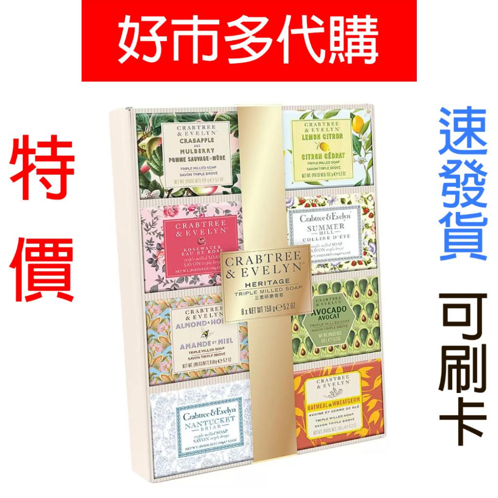 📌注意事項: ■【正品】商品下標後-才至『好市多』店內購入,效期都是賣場最新 ■【缺貨】若好市多缺貨商品會『聊聊』通知買家,下單後請留意『聊聊』通知 ■【超重超長限制】蝦皮店/超商均有限重5公斤/單邊長45公分內,總長105公分內限制,若超重及超長,請選『店到家宅配 - 大型包裹』或聊聊詢問 ■【其他好市多商品】若有其他想購買的好市多商品,但賣場沒上架,可聊聊詢問 品名 : Crabtree & Evelyn 香皂組 內容量/入數 : 150克 X 8入 使用方式 : 將香皂沾濕且均勻塗抹在手和身體上以產生泡沫,再以清水沖洗乾淨。 商品介紹: 8 種香味 : 玫瑰水、燕麥、夏日山丘、海棠果、酪梨、檸檬、杏仁、水澤香蕀叢花 單顆肥皂獨立包裝 精緻禮盒適合自用及送禮 加拿大製造