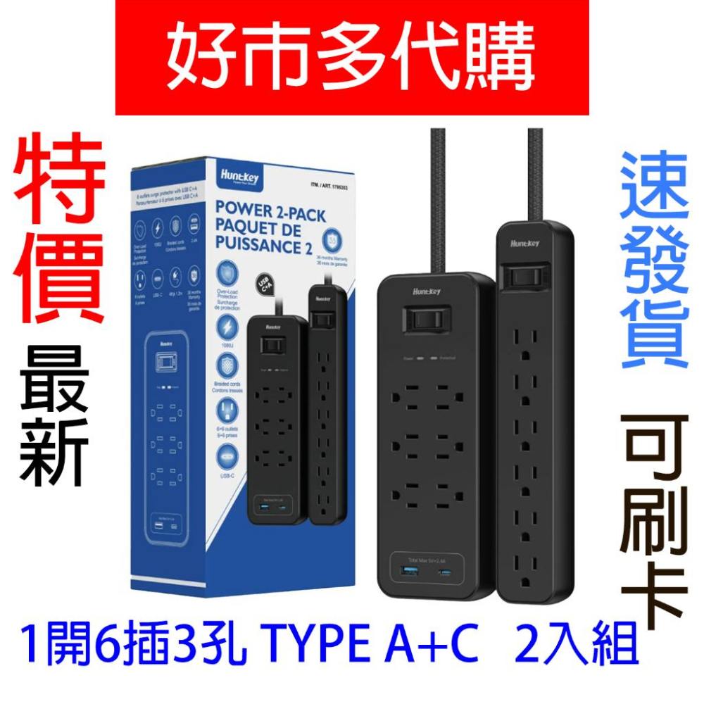 特價【Costco好市多代購】Huntkey 防突波 1開6插3孔 TYPE A+C 延長線 2入組 最新效期