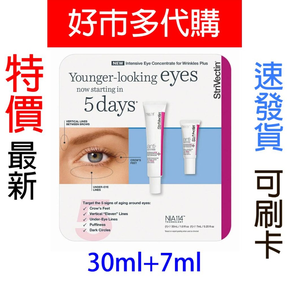 ※「7-11全家免運」取付>>賣場小編 📌注意事項: ■【正品】商品下標後-才至『好市多』店內購入,效期都是賣場最新 ■⛔️【缺貨】⛔️若好市多缺貨商品會『聊聊』通知買家取 消訂單,下單後請務必留意「聊聊」訊息 ■【超重超長限制】蝦皮店/超商均有限重5公斤/單邊長45公分內,總長105公分內限制,若超重及超長,請選『店到家宅配 - 大型包裹』或聊聊詢問 ■【其他好市多商品】若有其他想購買的好市多商品,但賣場沒上架,可聊聊詢問 品名 : StriVectin 淡紋眼霜 30毫升+7毫升 內容量/入數 : 30毫升 X 1 + 7毫升 X 1 使用方式 : 1. 早晚各使用一次 2. 用指頭輕輕拍打眼部下方和眶骨周圍 保存方式 : 請保存於乾涼處,避免陽光直射 商品敍述: 針對眼周開發的溫和配方 幫助肌膚維持彈力 幫助淡化撫平皺紋 強化肌膚防禦力 使眼周晶亮光澤 注意事項 : 1.僅供外用,若有過敏現象,請暫停使用並視情況就醫 2.使用時避免接觸眼睛 3.三歲以下孩童不得使用