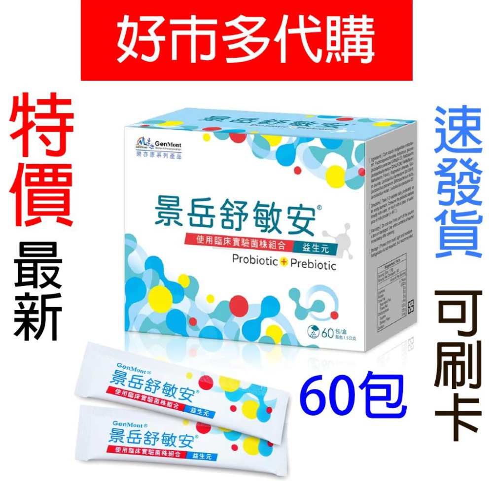 ※「7-11全家免運」取付>>賣場小編 📌注意事項: ■【正品】商品下標後-才至『好市多』店內購入,效期都是賣場最新 ■⛔️【缺貨】⛔️若好市多缺貨商品會『聊聊』通知買家取 消訂單,下單後請務必留意「聊聊」訊息 ■【超重超長限制】蝦皮店/超商均有限重5公斤/單邊長45公分內,總長105公分內限制,若超重及超長,請選『店到家宅配 - 大型包裹』或聊聊詢問 ■【其他好市多商品】若有其他想購買的好市多商品,但賣場沒上架,可聊聊詢問 品名 : 景岳舒敏安 益生菌粉包 60包 內容量/入數 : 1.5公克 X 60入 成分 : 玉米澱粉、玉米來源可溶性纖維、果寡糖、無水葡萄糖、副乾酪乳桿菌Lactobacillus paracasei 133、麥芽糊精、發酵乳桿菌 Lactobacillus fermentum GMNL®-296、香草香料(麥芽糊精、丙二醇、香料基劑)、硬脂酸鎂、二氧化矽、發酵乳桿菌 Lactobacillus fermentum GM-090®、植物乳桿菌 Lactobacillus plantarum、雷特氏 B 菌 Bifidobacterium lactis、羅伊氏乳桿菌 Lactobacillus reuteri、副乾酪乳桿菌 Lactobacillus paracasei 33 使用方式 : 每日1-2包,空腹時食用較佳 直接搭配開水或混入果汁、奶粉中食用,水溫勿超過45°C 保存方式 : 請置於陰涼乾燥避光處,冷藏尤佳。 注意事項 : 1. 本包裝如有任何瑕疵,請勿使用。 2. 鋁袋開封後請盡速使用完畢。 食品業登錄字號 : 景岳非登證書-工廠D-112715847-00001-7 景岳非登證書-公司D-112715847-00000-6 製造/進口商名稱 : 景岳生物科技股份有限公司 製造/進口商電話 : 0800-081-668 製造/進口商地址 : 臺南市善化區南科七路8號 產品責任險契約字號 : 新光產物保險130814AHP0000701號