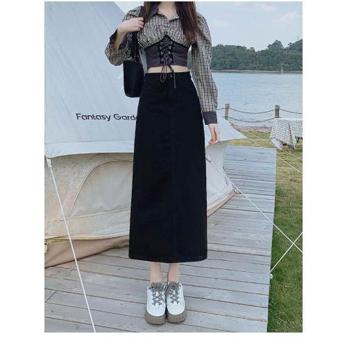 全新便宜轉賣!【瘦子看這】98%棉可調節腰扣高腰開衩黑色牛仔半身裙a字中長直筒包臀裙水洗牛仔裙