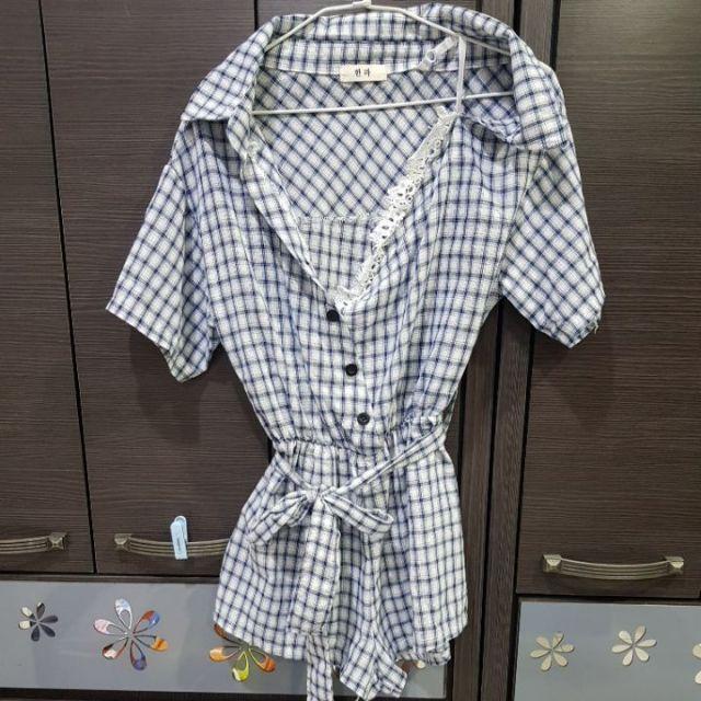 全新性感露肩細肩帶鈕扣格紋襯衫感連身短褲 連身褲 蕾絲 綁帶 蝴蝶結 顯瘦 超性感