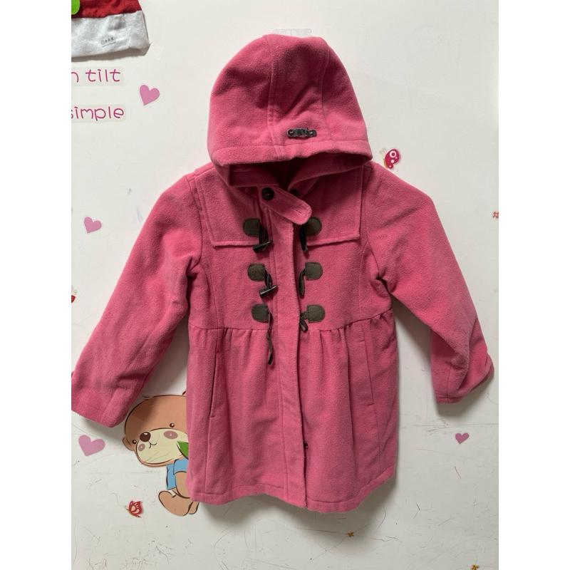 BABYKING兒童牛角扣粉色連帽長版外套/約110公分兒童外套/毛呢連帽保暖外套