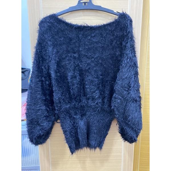 黑色毛絨絨一字領針織露肩短版上衣/保暖上衣/顯瘦可愛超舒適/縮腰/內裡/內搭