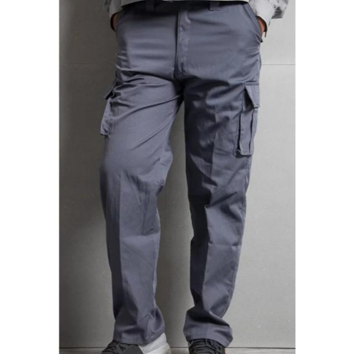 雙立體側口袋│工作褲 顏色:藍灰 材質:60% cotton  40% polyester   特規材質,增加舒適透氣兼顧耐用 產地:臺灣 產品說明:左右斜插口袋,大腿兩側立體大口袋魔鬼氈、後面兩口袋。 腰部兩側鬆緊
