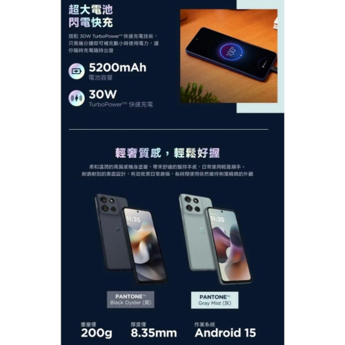 IP69 超防水平價手機 Motorola g56 5G 6.7 吋 120Hz 螢幕 Motorola g56 5G 配備 6.7 吋 2,400 x 1,080pixels 解析度 LCD「挖孔」螢幕,採用 20:9 螢幕比例,享有廣闊的觀看視野,具備 120Hz 螢幕更新率,搭配 Dolby Atmos 立體聲喇叭,無論追劇、手遊,都能帶來沉浸式的視聽體驗;額外具備高亮度模式,即使在陽光下也能呈現清晰銳利的畫面細節。 Pantone 機身配色 Motorola g56 5G 螢幕正面覆蓋康寧大猩猩玻璃 7i,提高手機抗摔保護力,同時具備 IP68、IP69 防塵防水等級以及軍規防護測試,日常使用更放心。機身背蓋使用柔軟純素皮革飾面,帶來舒適柔和的握持手感,創造獨特個人風格,提供 Pantone 的黑、灰兩款顏色可選。 聯發科天璣 7060 Motorola g55 5G 運行 Android 15 作業系統,搭載聯發科天璣 7060 八核心處理器,內建 8GB RAM + 128GB ROM,還可透過 microSD 記憶卡擴充 2TB 儲存空間,提供 5G 單卡上網、eSIM,具備 Wi-Fi 5、藍牙 5.3、NFC 等功能;內建 5,200mAh 電池,支援 30W TurboPower 快充。 5,000 萬畫素主鏡頭 Motorola g56 5G 後置 5,000 萬畫素主鏡頭 + 800 萬畫素超廣角鏡頭,主相機具備 Sony LYTIA 600 感光元件、 PDAF 相位對焦與 Quad Pixel 四合一畫素技術,結合 AI 影像演算法與人像模式,帶來和高清晰度、逼真色彩和美麗的自然人像;內建自動夜景模式與笑臉捕捉功能,可隨時捕捉每一瞬間的畫面。前置 3,200 萬畫素自拍鏡頭,支援人像美顏、臉部辨識解鎖。 Motorola g56 5G 功能特色 ◎ Android 15 作業系統  ◎ 5G 上網(搭配 eSIM 可支援雙卡雙待) ◎ 6.7 吋 2,400 x 1,080pixels 解析度 LCD 螢幕 (120Hz 螢幕更新率) ◎ 聯發科天璣 7060 八核心處理器 ◎ 8GB RAM / 128GB ROM ◎ IP68、IP69 防塵防水等級 ◎ 後置 5,000 萬畫素主鏡頭 + 800 萬畫素超廣角鏡頭 ◎ 前置 3,200 萬畫素自拍鏡頭 ◎ Wi-Fi 5、藍牙 5.3、NFC ◎ 指紋辨識、臉部解鎖 ◎ 5,200mAh 電量 ◎ 採用 USB Type-C 規格,支援 30W TurboPower 快充 ◎ 支援 microSD 記憶卡,最高可擴充至 2TB 儲存空間 ◎ 3.5mm 耳機孔