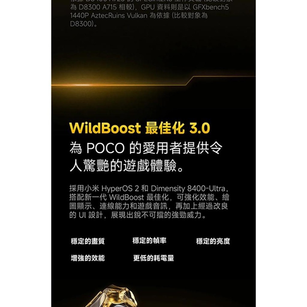 大螢幕防水抓拍手機 POCO X7 Pro 3,200nits 峰值亮度 POCO X7 Pro 配備 6.67 吋 CrystalRes 1.5K AMOLED 挖孔螢幕,支援 120Hz 更新率、16 倍超解析度觸控以及 2,560Hz 瞬時觸控取樣率,遊戲操作流暢順滑。螢幕具備 3,200nits 峰值亮度,即使在陽光下也清晰可見,並支援 Pro HDR、Dolby Vision、HDR10+、680 億色彩、12-bit 色深、5,000,000:1 對比度與 P3 廣色域。同時提供 20,000 級亮度調節與 1920Hz PWM 調光,並通過德國萊茵 TÜV 三重護眼認證,還支援濕手操作,在潮濕環境中也能輕鬆使用。  IP68 防塵防水等級 POCO X7 Pro 機身採用效能導向外觀設計,以紋理縫線和賽道風格的裝飾為特色,結合頂級雙渦輪環設計,其中「黃色」版本背蓋採用皮革紋理,四邊均勻曲面帶來更舒適的握持手感,也提升外觀質感;正面使用康寧大猩猩 7i 防護玻璃,首次搭載 IP68 防塵防水等級;具備雙喇叭揚聲器,支援 Dolby Atmos、AI 超級劇院,透過演算法享受更震撼的音效體驗,;同時帶來光學螢幕下指紋辨識與臉部辨識。    聯發科天璣 8400-Ultra POCO X7 Pro 運行 Android 14 作業系統、 Xiaomi HyperOS 2 操作介面,搭載聯發科天璣 8400-Ultra 八核心處理器,提供 8GB RAM / 256GB ROM、12GB RAM / 256GB ROM、 12GB RAM / 512GB ROM, 具備 5G + 5G 雙卡雙待、Wi-Fi 6、藍牙 5.4、NFC、紅外線遙控器; 更擁有 WildBoost 最佳化 3.0,提供最佳效能。使用 LiquidCool 水冷技術 4.0,結合大面積散熱板覆蓋與智慧溫控,有效散熱並保持穩定性。續航方面,配備 6,000mAh 電量,支援 90W 快充,擁有 搭配 P2 快速充電晶片、G1 電池管理晶片,充電智慧調節並延長電池壽命。支援 AI 筆記、AI 錄音機與 AI 同聲翻譯等功能。    IMX 882 感光元件  POCO X7 Pro 後置 6,400 萬畫素主鏡頭 + 800 萬畫素超廣角鏡頭,主鏡頭具備 SONY IMX 882 感光元件,以及 OIS 和 EIS 雙重防手震,搭配支援 RAW 演算法 POCO 成像引擎與 AI 演算法、支援雙焦距自拍、UltraSnap 抓拍、低延遲抓拍、50FPS 連拍、動態追焦 2.0。其他方面,擁有 AI 智慧擴圖、AI 魔法消除 Pro、AI 智慧成片等 AI 功能,和 Live Photo 動態照片。 鋼鐵人聯名款 POCO X7 Pro 額外推出「鋼鐵人聯名款」,提供 12GB RAM / 512GB ROM 版本。這款與漫威獨家合作的版本完美體現鋼鐵人的經典風格,擁有流線的外觀設計,背蓋上鋼鐵人頭盔和方舟反應爐的精緻立體浮雕,搭配著鉑金鑲嵌工藝,霧面與亮面加上閃爍紋理的搭配,賦予頭盔微妙的光輝,方舟反應爐的複雜科技圖形則顯現這個經典角色的強大與不凡。背蓋底部,使用金屬浮雕工藝打造復仇者聯盟標誌,金色點綴與深紅色背蓋形成鮮明的對比,並將標誌性的元素融入客製化的 UI 介面、手機殼、SIM 卡針設計中,並打造專屬收藏禮盒。 POCO X7 Pro 功能特色  ◎ 5G + 5G 雙卡雙待  ◎ Android 14 作業系統、 Xiaomi HyperOS 2 操作介面  ◎ 6.67 吋 2,712 x 1,220pixels 解析度 CrystalRes 1.5K AMOLED 螢幕(120Hz 螢幕更新率)  ◎ 聯發科天璣 8400-Ultra 八核心處理器  ◎ 8GB RAM / 256GB ROM、12GB RAM / 256GB ROM、 12GB RAM / 512GB ROM ◎ 鋼鐵人聯名款: 12GB RAM / 512GB ROM ◎ 前置 2,000 萬畫素自拍鏡頭  ◎ 後置 5,000 萬畫素主鏡頭 + 800 萬畫素超廣角鏡頭 ◎ Wi-Fi 6、藍牙 5.4、NFC、紅外線遙控器  ◎ 光學螢幕下指紋辨識、臉部辨識  ◎ 配備 6,000mAh 電量  ◎ 採用 USB Type-C 規格,支援 90W 快充  ◎ IP68 防塵防水等級