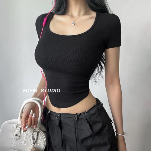 全新M號美式復古方領緊身褶皺收腰純色短袖T恤 露腰打底上衣
