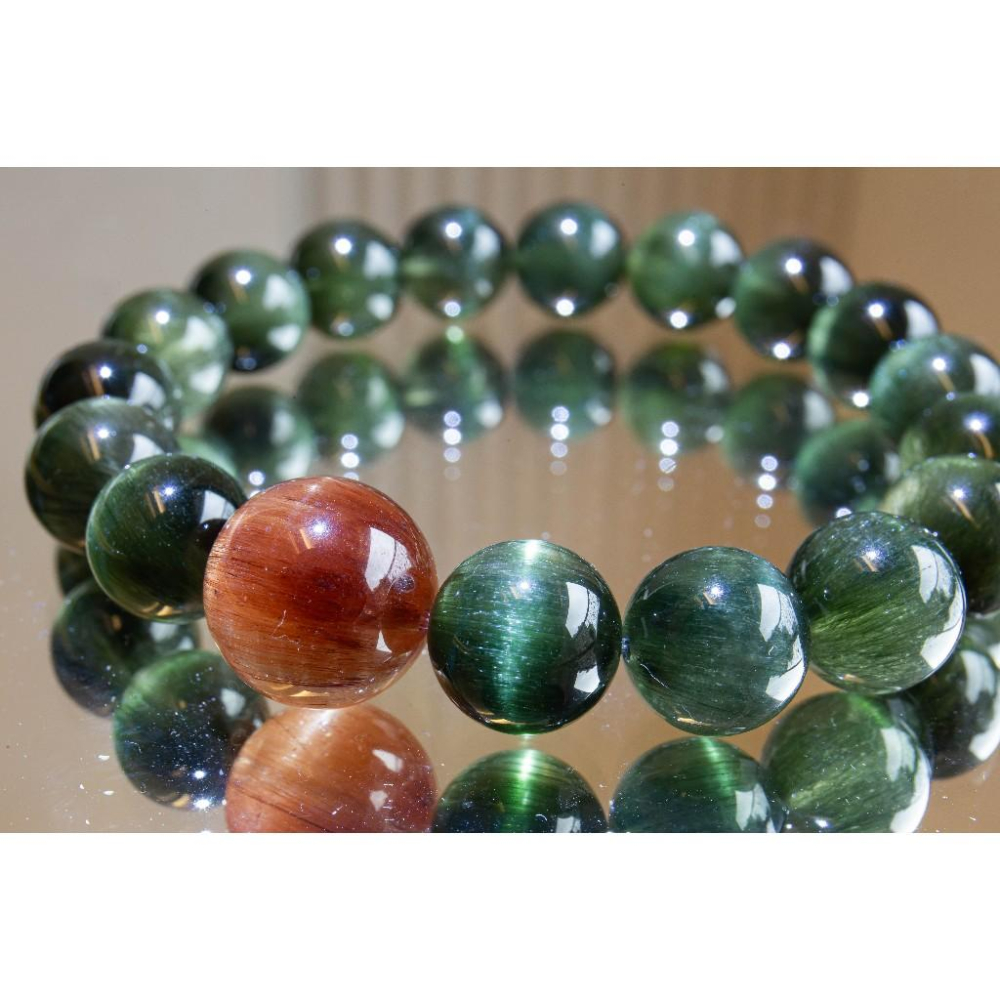【貓眼綠髮晶】11.6mm搭配14mm紅兔毛主珠✨事業招財必備|旺正財與貴人運|溫潤絲絨質感|現貨實拍|晶心書蘊