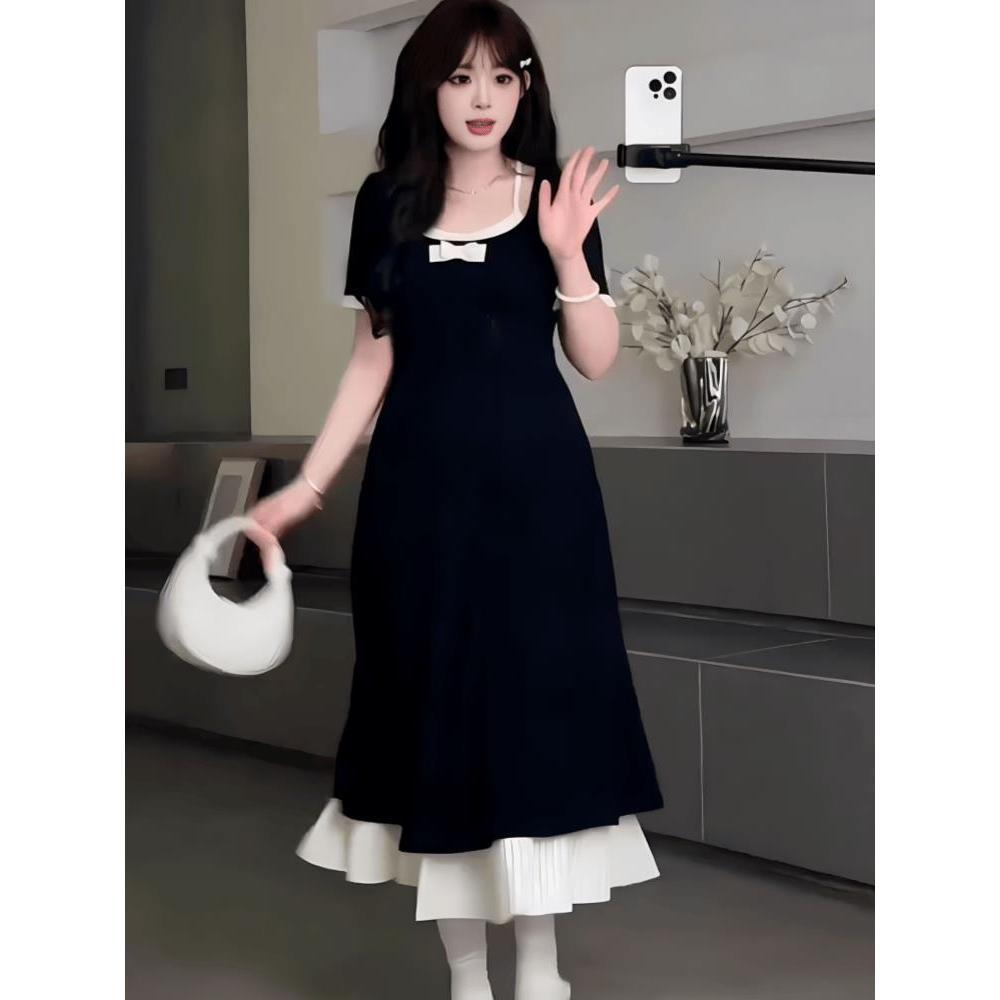 大尺碼法式假兩件設計感洋裝女夏季2025新款微胖mm收腰氣質小黑裙