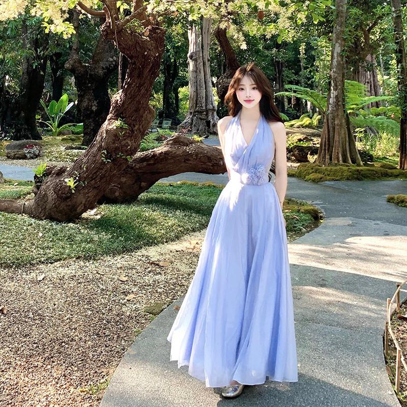 法式純欲仙女藍色掛脖洋裝子女設計感收腰氣質度假露背長裙夏季