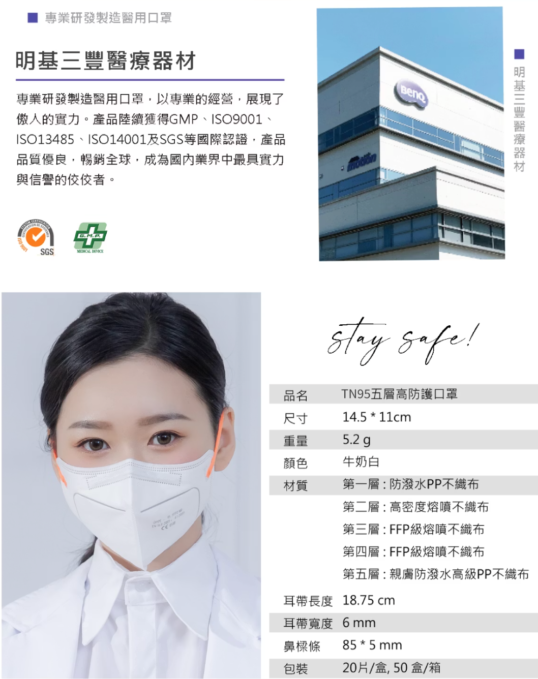 ●主要成分或材料 : 五層不織布結構、耳掛帶、鼻樑壓條