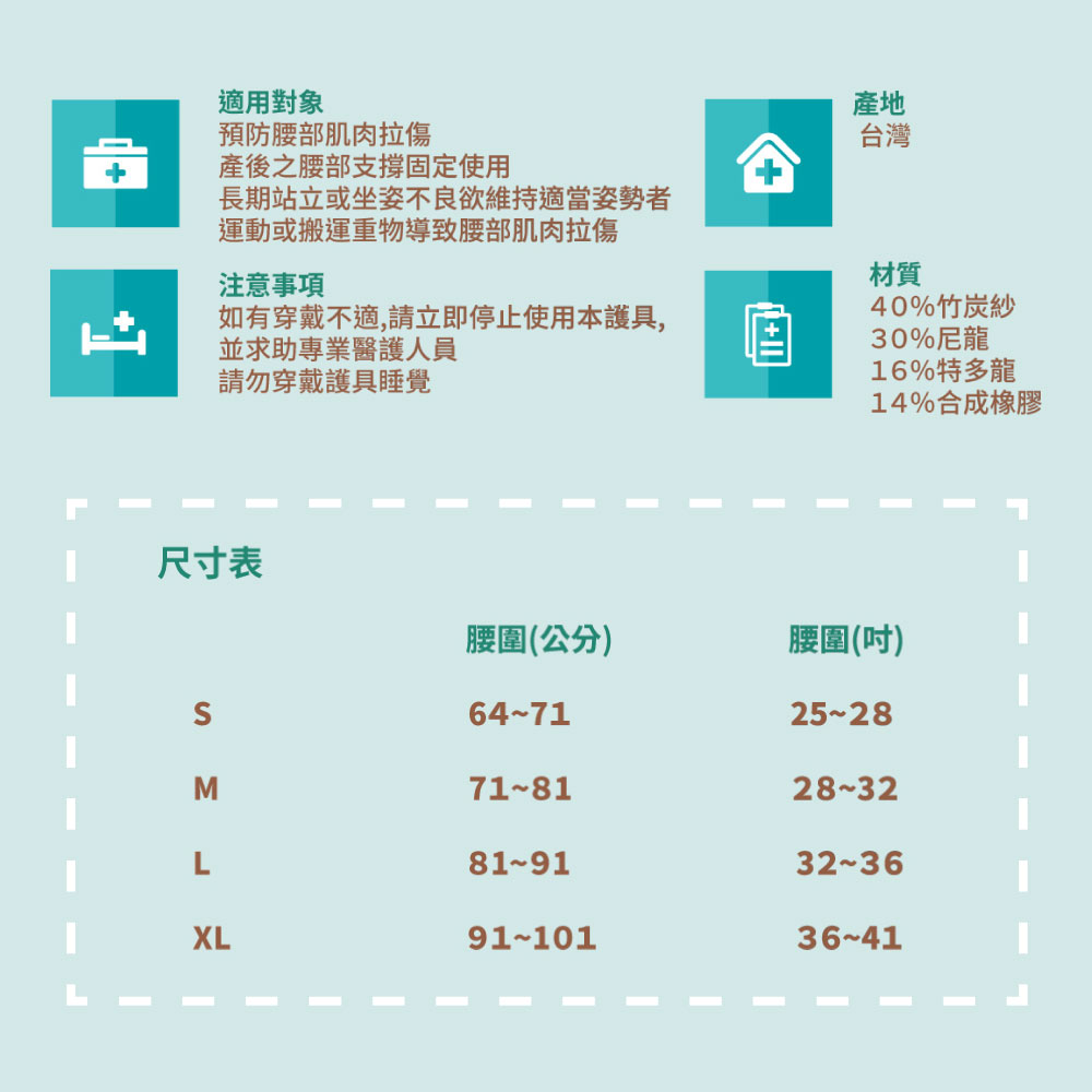 10. 用途: 預防腰背部肌肉拉傷, 腰部支撐固定使用, 站立或坐姿不良欲維持姿勢適當者, 運動或搬運重物導致的腰部拉傷