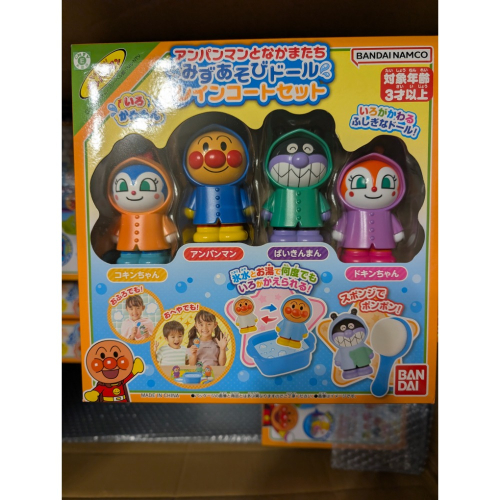 商品介紹:這款套裝包含麵包超人和他的朋友們,他們都穿著神奇的變色雨衣。只要將冰水(約10℃以下)和熱水(約30℃以上)淋在他們身上,就能反覆享受變色的樂趣!套裝內含一塊可用於冰水和熱水的海綿、一個用來裝冰水的桶,以及一張印有公園圖案的防水墊。孩子們可以在房間裡玩,也可以在浴缸裡玩!