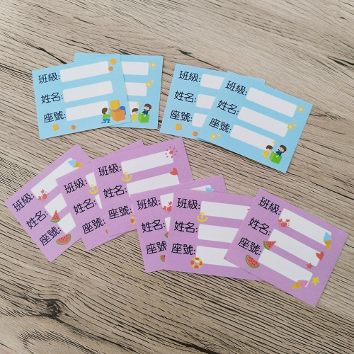 可以自己手寫的姓名貼,略防水可以使用原子筆奇異筆書寫(但須等待乾燥)