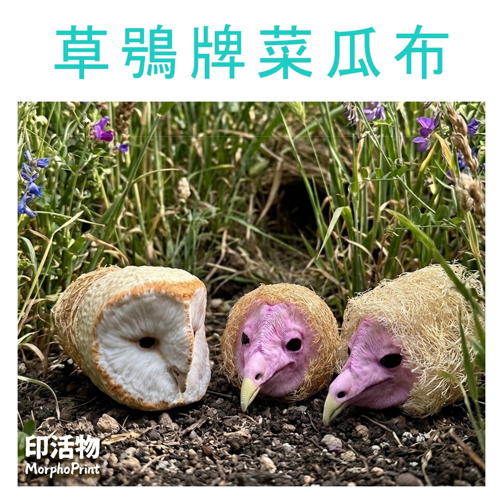 本作品聚焦於台灣特有且珍稀的草原隱士——「草鴞」。我們捕捉了這群棲息於高草叢中、擁有獨特心型臉盤的夜行性猛禽神韻。為了讓大眾對這個瀕危物種有更深刻的印象,本作品大膽採用跨材質設計,將精細的草鴞成鳥與幼鳥模型,與台灣在地生產的天然「菜瓜絡」完美結合。天然菜瓜絡交織的纖維,巧妙還原了草鴞隱蔽於荒野深草中的生態意象。這不僅是一件充滿生物細節的立體微縮,更是兼具實用性與趣味感的居家逸品,展現了生態設計融入日常的最美姿態。