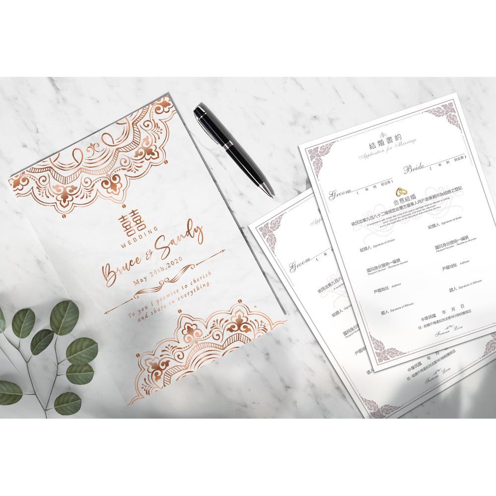https://s-cf-tw.shopeesz.com/file/tw-11134208-7r992-ltm7fyhy2mb31b 商品:精裝裱版結婚證書夾  尺寸:29.2x20.3公分 材質:(封面) 彩色印刷 書約符合戶政事務所的規定,書約無印新人名字...等個人資訊,需自行手寫資料上去及簽名喔 說明:封面可印製新人名、婚期    下單後,請提供    1.新人名字( 如不印名字也可以更換其他文字)    2.登記日/婚期/紀念 (不確定日期建議不印) 證書夾封面會提供校稿確認,如內容有任何問題請於印製前提出,如確認定稿後無法幫您重印或修改~請知悉! 製作流程: 蝦皮下單並提供資料→排稿&確認(依校稿時間而定)→定稿→印刷(7天)→寄出 ★如有不清楚的地方歡迎用聊聊詢問喔! ⛔此商品屬 「依消費者要求所為之客製化給付」,不適用7天鑑賞期法規。 ⛔客製商品~恕不提供貨到付款服務 ★螢幕顯示與印刷成品會產生色差。(電腦螢幕,因不同品牌、型號及個別色彩設定參數,也會造成顏色觀看上的不同。 ★證書夾表面皆有上膜處理,霧膜會讓印刷品表面有霧化效果,顏色也會較沉哦。 👉如要加購證書夾周邊(雙側緞帶、書約、婚紗照等)請這邊加購 https://shopee.tw/product/149788736/6833099092/ ★辦理結婚登記時請攜帶以下文件: 1.結婚書約 2.雙方之戶口名簿 3.雙方之國民身分證/若為外籍人士需帶護照 4.新式身分證規格照片各1張 5.換領國民身分證各50元規費、戶口名簿各30元規費 ★注意: 1.結婚當事人兩位需要在登記當日親自到戶政事務所辦理,但結婚書約上簽名的兩位證人不需要到現場。 2.可以向任一戶政事務所辦理結婚登記。若需同時辦理遷入戶籍,則應選擇遷入地戶政事務所辦理。 #婚禮小物 #婚禮週邊 #簽名綢 #貼紙 #結婚書夾 #結婚證書 #結婚書約 #登記專用 #婚禮 #婚約