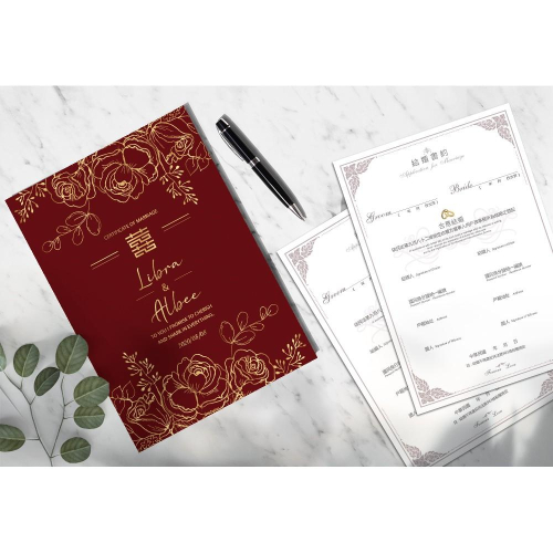 https://s-cf-tw.shopeesz.com/file/tw-11134208-7rasf-m0xsd890n5nab0 商品:精裝裱版結婚證書夾  尺寸:29.2x20.3公分 材質:(封面) 彩色印刷 書約符合戶政事務所的規定,書約無印新人名字...等個人資訊,需自行手寫資料上去及簽名喔 說明:封面可印製新人名、婚期    下單後,請提供    1.新人名字( 如不印名字也可以更換其他文字)    2.登記日/婚期/紀念 (不確定日期建議不印) 證書夾封面會提供校稿確認,如內容有任何問題請於印製前提出,如確認定稿後無法幫您重印或修改~請知悉! 製作流程: 蝦皮下單並提供資料→排稿&確認(依校稿時間而定)→定稿→印刷(7天)→寄出 ★如有不清楚的地方歡迎用聊聊詢問喔! ⛔此商品屬 「依消費者要求所為之客製化給付」,不適用7天鑑賞期法規。 ⛔客製商品~恕不提供貨到付款服務 ★螢幕顯示與印刷成品會產生色差。(電腦螢幕,因不同品牌、型號及個別色彩設定參數,也會造成顏色觀看上的不同。 ★證書夾表面皆有上膜處理,霧膜會讓印刷品表面有霧化效果,顏色也會較沉哦。 👉如要加購證書夾周邊(雙側緞帶、書約、婚紗照等)請這邊加購 https://shopee.tw/product/149788736/6833099092/ ★辦理結婚登記時請攜帶以下文件: 1.結婚書約 2.雙方之戶口名簿 3.雙方之國民身分證/若為外籍人士需帶護照 4.新式身分證規格照片各1張 5.換領國民身分證各50元規費、戶口名簿各30元規費 ★注意: 1.結婚當事人兩位需要在登記當日親自到戶政事務所辦理,但結婚書約上簽名的兩位證人不需要到現場。 2.可以向任一戶政事務所辦理結婚登記。若需同時辦理遷入戶籍,則應選擇遷入地戶政事務所辦理。 #婚禮小物 #婚禮週邊 #簽名綢 #貼紙 #結婚書夾 #結婚證書 #結婚書約 #登記專用 #婚禮 #婚約