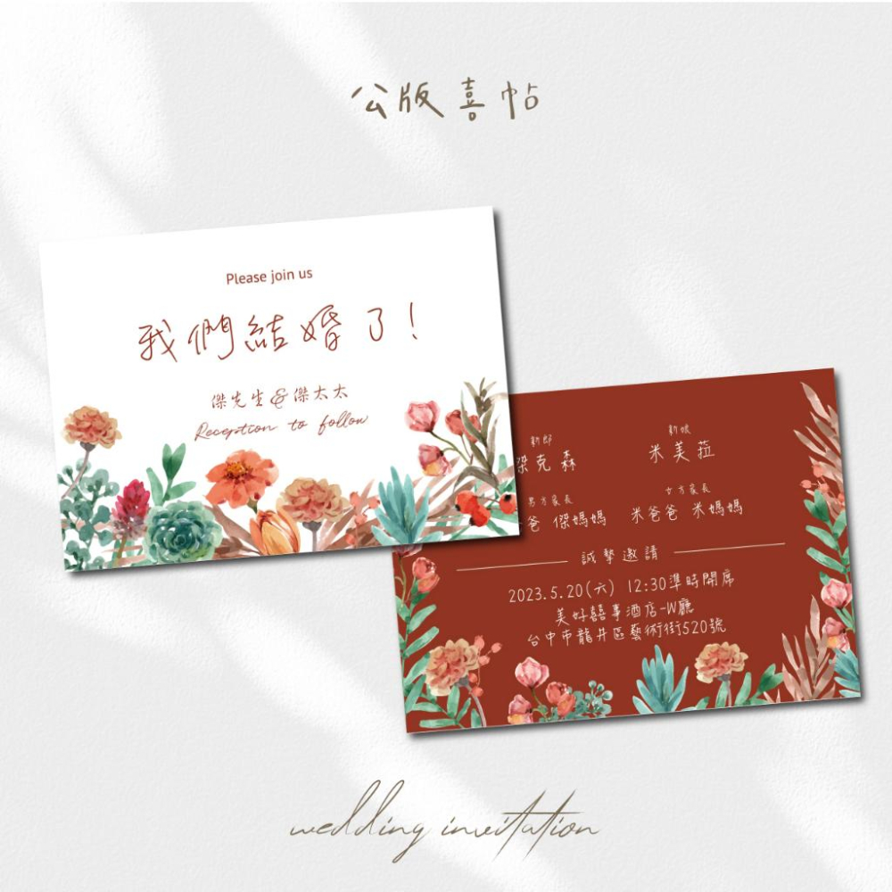 🧡韓式喜帖 ★頁面價格為喜帖單價,訂購數量以10為單位, 20張、30張、40 張、50張 ...以此類推 ★同款式&內容為一版,不同版 數量請分開累計 ★請先備好喜帖資料,確定婚禮時間 再做訂購 ★預設紙材使用星幻卡(285g),如需要其他紙材可另外詢問 👉製作流程: ✦流程:挑選款式 ➔ 下單並完成付款 ➔ 傳資料 ➔ 排版 ➔ 校稿 ➔ 沒問題後再印刷 ♡ ★下單後請提供以下資料 1.新郎/新娘名字 2.男方/女方家長名字 3.結婚日期/宴客時間/星期 4.宴客地點(婚宴餐廳名稱/地址) 5.版面與字體編號(可以選擇範例圖片版面,或者版面A-L擇1;字體如有指定也請備註編號) 6.如選擇的款式有照片,照片請另傳至信箱(聊聊詢問提供信箱位置) 7.如選擇套組,請選擇信封顏色&封口貼編號 👉訂購方式:請依需求選擇對應數量與項目作下單 例如:需要數量70張,請選擇項目[ 70張(單價) ] 數量輸入 70  例如:需要數量100張,請選擇項目[ 100張(單價) ] 數量輸入 100  以此類推,系統會自動帶入總金額 A:單購-卡片尺寸:11.5x16cm (單張雙面) B:套組-卡片(11.5x16cm)+信封&封口貼(套組含卡片+250g厚磅珠光信封(17.6 x12.6 cm)三款顏色可選,和3.5cm信封圓貼) 👉紙卡材質:(如未指定,將以星幻卡印刷) ①星幻紙卡:紙材非純白色 底色顯淡黃色光澤 印刷成品帶珠光效果 ②瑞典一級卡:一般的紙卡.但比一般紙材稍微再厚一些些 ③象牙卡:紙張平滑且紮實,色彩沈穩,印刷色彩飽和度低 ④雅紋紙:表面帶有細小的水波橫紋,質感雅緻,觸感溫柔適中 ⑤細紋紙:紙張有不規則細沙狀的壓紋,觸感特殊 📢備註: 1.每張的所有圖文皆需相同,如不同內容數量請分開累計。 2.建議您確認印刷張數,並加上備用張數後再下單,若未來追加,數量重新累計,以另一筆訂單計算。 3.定稿排印後,無法接受臨時取消或訂單與內容修改。 4.內容校對再煩請確實校對無誤,若確認過後送印才發現資訊錯誤或錯字,由買家負擔重印的費用。 5.客製商品不適用七天鑑賞期,商品送印刷後,無法取消或退貨。 ⚠️關於色差 螢幕色彩以及印刷色彩的色域並不相同,故會顯現不同的色彩。簡單來說印刷色彩顏色偏暗,油墨印不出一些特別明亮色彩,印刷也會因會紙張的不同而影響顏色。故收到印刷品與螢幕上所看到的圖稿會有所色差皆為正常的哦。 ★螢幕色彩為RGB→透過發光的螢幕色彩都比較鮮豔明亮 ★印刷則為CMYK→印刷成品會比螢幕色彩彩度偏暗一些哦! 印刷品輸出之色差值,無法以客戶之螢幕為基準。因不同紙材、每一批墨水跟印製時間,皆會影響圖型整體色彩,如對於顏色有精準的要求 請勿下單!  ⛔此商品屬 「依消費者要求所為之客製化給付」,不適用7天鑑賞期法規。 ⛔客製商品~恕不提供貨到付款服務 #單張喜帖 #明信片單張喜帖 #簡約風格喜帖 #大理石喜帖 #紅色系喜帖 #明信片式喜帖 #創意喜帖 #喜帖 #婚卡 #請柬 #結婚請柬