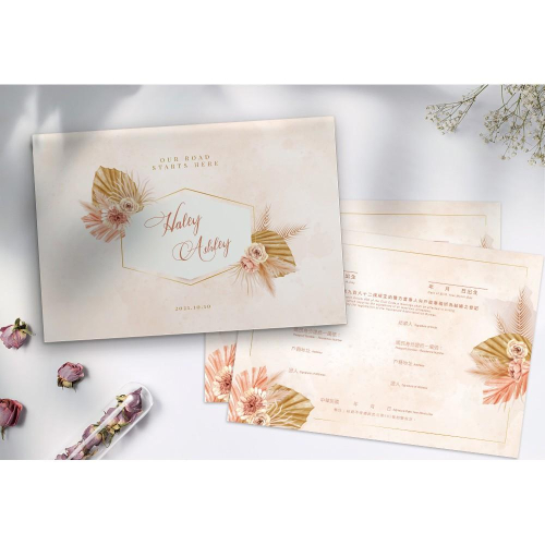 商品:精裝裱版結婚證書夾  尺寸:29.2x20.3公分 材質:(封面) 彩色印刷 書約符合戶政事務所的規定,書約無印新人名字...等個人資訊,需自行手寫資料上去及簽名喔 說明:封面可印製新人名、婚期    下單後,請提供    1.新人名字( 如不印名字也可以更換其他文字)    2.登記日/婚期/紀念 (不確定日期建議不印) 證書夾封面會提供校稿確認,如內容有任何問題請於印製前提出,如確認定稿後無法幫您重印或修改~請知悉! 製作流程: 蝦皮下單並提供資料→排稿&確認(依校稿時間而定)→定稿→印刷(7天)→寄出 ★如有不清楚的地方歡迎用聊聊詢問喔! ⛔此商品屬 「依消費者要求所為之客製化給付」,不適用7天鑑賞期法規。 ⛔客製商品~恕不提供貨到付款服務 ★螢幕顯示與印刷成品會產生色差。(電腦螢幕,因不同品牌、型號及個別色彩設定參數,也會造成顏色觀看上的不同。 ★證書夾表面皆有上膜處理,霧膜會讓印刷品表面有霧化效果,顏色也會較沉哦。 👉如要加購證書夾周邊(雙側緞帶、書約、婚紗照等)請這邊加購 https://shopee.tw/product/149788736/6833099092/ ★辦理結婚登記時請攜帶以下文件: 1.結婚書約 2.雙方之戶口名簿 3.雙方之國民身分證/若為外籍人士需帶護照 4.新式身分證規格照片各1張 5.換領國民身分證各50元規費、戶口名簿各30元規費 ★注意: 1.結婚當事人兩位需要在登記當日親自到戶政事務所辦理,但結婚書約上簽名的兩位證人不需要到現場。 2.可以向任一戶政事務所辦理結婚登記。若需同時辦理遷入戶籍,則應選擇遷入地戶政事務所辦理。 #婚禮小物 #婚禮週邊 #簽名綢 #貼紙 #結婚書夾 #結婚證書 #結婚書約 #登記專用 #婚禮 #婚約