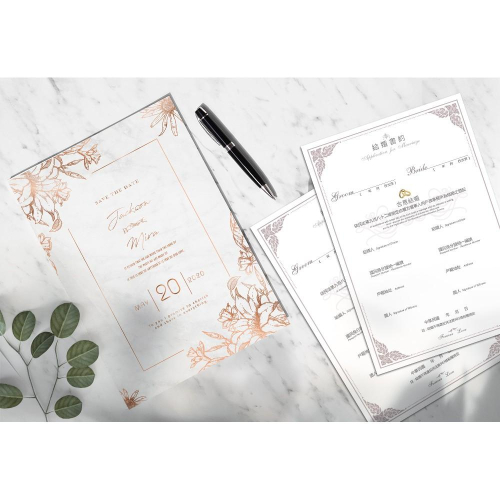 https://s-cf-tw.shopeesz.com/file/tw-11134208-7r98u-ltm77gjfvtsr4a 商品:精裝裱版結婚證書夾  尺寸:29.2x20.3公分 材質:(封面) 彩色印刷 書約符合戶政事務所的規定,書約無印新人名字...等個人資訊,需自行手寫資料上去及簽名喔 說明:封面可印製新人名、婚期    下單後,請提供    1.新人名字( 如不印名字也可以更換其他文字)    2.登記日/婚期/紀念 (不確定日期建議不印) 證書夾封面會提供校稿確認,如內容有任何問題請於印製前提出,如確認定稿後無法幫您重印或修改~請知悉! 製作流程: 蝦皮下單並提供資料→排稿&確認(依校稿時間而定)→定稿→印刷(7天)→寄出 ★如有不清楚的地方歡迎用聊聊詢問喔! ⛔此商品屬 「依消費者要求所為之客製化給付」,不適用7天鑑賞期法規。 ⛔客製商品~恕不提供貨到付款服務 ★螢幕顯示與印刷成品會產生色差。(電腦螢幕,因不同品牌、型號及個別色彩設定參數,也會造成顏色觀看上的不同。 ★證書夾表面皆有上膜處理,霧膜會讓印刷品表面有霧化效果,顏色也會較沉哦。 👉如要加購證書夾周邊(雙側緞帶、書約、婚紗照等)請這邊加購 https://shopee.tw/product/149788736/6833099092/ ★辦理結婚登記時請攜帶以下文件: 1.結婚書約 2.雙方之戶口名簿 3.雙方之國民身分證/若為外籍人士需帶護照 4.新式身分證規格照片各1張 5.換領國民身分證各50元規費、戶口名簿各30元規費 ★注意: 1.結婚當事人兩位需要在登記當日親自到戶政事務所辦理,但結婚書約上簽名的兩位證人不需要到現場。 2.可以向任一戶政事務所辦理結婚登記。若需同時辦理遷入戶籍,則應選擇遷入地戶政事務所辦理。 #婚禮小物 #婚禮週邊 #簽名綢 #貼紙 #結婚書夾 #結婚證書 #結婚書約 #登記專用 #婚禮 #婚約