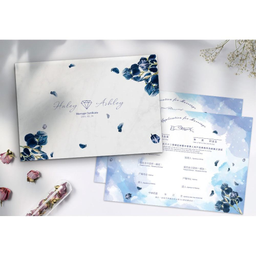 商品:精裝裱版結婚證書夾  尺寸:29.2x20.3公分 材質:(封面) 彩色印刷 書約符合戶政事務所的規定,書約無印新人名字...等個人資訊,需自行手寫資料上去及簽名喔 說明:封面可印製新人名、婚期    下單後,請提供    1.新人名字( 如不印名字也可以更換其他文字)    2.登記日/婚期/紀念 (不確定日期建議不印) 證書夾封面會提供校稿確認,如內容有任何問題請於印製前提出,如確認定稿後無法幫您重印或修改~請知悉! 製作流程: 蝦皮下單並提供資料→排稿&確認(依校稿時間而定)→定稿→印刷(7天)→寄出 ★如有不清楚的地方歡迎用聊聊詢問喔! ⛔此商品屬 「依消費者要求所為之客製化給付」,不適用7天鑑賞期法規。 ⛔客製商品~恕不提供貨到付款服務 ★螢幕顯示與印刷成品會產生色差。(電腦螢幕,因不同品牌、型號及個別色彩設定參數,也會造成顏色觀看上的不同。 ★證書夾表面皆有上膜處理,霧膜會讓印刷品表面有霧化效果,顏色也會較沉哦。 👉如要加購證書夾周邊(雙側緞帶、書約、婚紗照等)請這邊加購 https://shopee.tw/product/149788736/6833099092/ ★辦理結婚登記時請攜帶以下文件: 1.結婚書約 2.雙方之戶口名簿 3.雙方之國民身分證/若為外籍人士需帶護照 4.新式身分證規格照片各1張 5.換領國民身分證各50元規費、戶口名簿各30元規費 ★注意: 1.結婚當事人兩位需要在登記當日親自到戶政事務所辦理,但結婚書約上簽名的兩位證人不需要到現場。 2.可以向任一戶政事務所辦理結婚登記。若需同時辦理遷入戶籍,則應選擇遷入地戶政事務所辦理。 #婚禮小物 #婚禮週邊 #簽名綢 #貼紙 #結婚書夾 #結婚證書 #結婚書約 #登記專用 #婚禮 #婚約