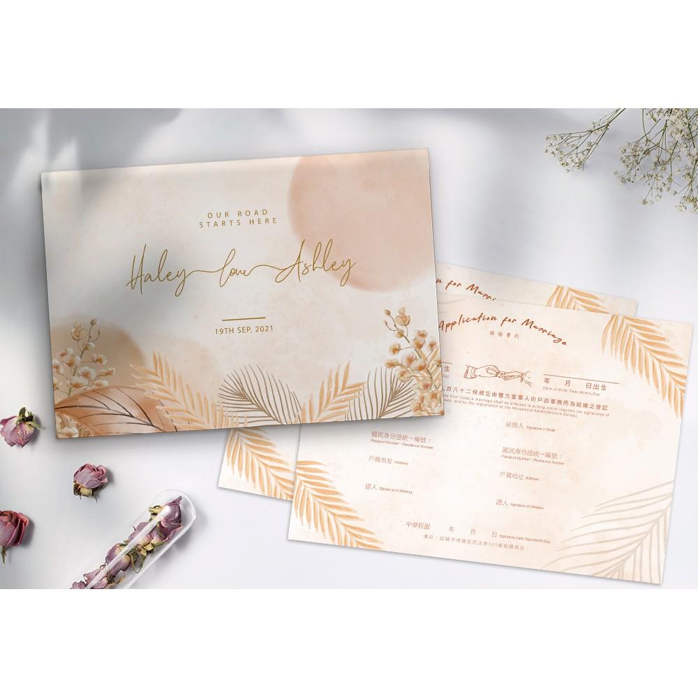 商品:精裝裱版結婚證書夾  尺寸:29.2x20.3公分 材質:(封面) 彩色印刷 書約符合戶政事務所的規定,書約無印新人名字...等個人資訊,需自行手寫資料上去及簽名喔 說明:封面可印製新人名、婚期    下單後,請提供    1.新人名字( 如不印名字也可以更換其他文字)    2.登記日/婚期/紀念 (不確定日期建議不印) 證書夾封面會提供校稿確認,如內容有任何問題請於印製前提出,如確認定稿後無法幫您重印或修改~請知悉! 製作流程: 蝦皮下單並提供資料→排稿&確認(依校稿時間而定)→定稿→印刷(7天)→寄出 ★如有不清楚的地方歡迎用聊聊詢問喔! ⛔此商品屬 「依消費者要求所為之客製化給付」,不適用7天鑑賞期法規。 ⛔客製商品~恕不提供貨到付款服務 ★螢幕顯示與印刷成品會產生色差。(電腦螢幕,因不同品牌、型號及個別色彩設定參數,也會造成顏色觀看上的不同。 ★證書夾表面皆有上膜處理,霧膜會讓印刷品表面有霧化效果,顏色也會較沉哦。 👉如要加購證書夾周邊(雙側緞帶、書約、婚紗照等)請這邊加購 https://shopee.tw/product/149788736/6833099092/ ★辦理結婚登記時請攜帶以下文件: 1.結婚書約 2.雙方之戶口名簿 3.雙方之國民身分證/若為外籍人士需帶護照 4.新式身分證規格照片各1張 5.換領國民身分證各50元規費、戶口名簿各30元規費 ★注意: 1.結婚當事人兩位需要在登記當日親自到戶政事務所辦理,但結婚書約上簽名的兩位證人不需要到現場。 2.可以向任一戶政事務所辦理結婚登記。若需同時辦理遷入戶籍,則應選擇遷入地戶政事務所辦理。 #婚禮小物 #婚禮週邊 #簽名綢 #貼紙 #結婚書夾 #結婚證書 #結婚書約 #登記專用 #婚禮 #婚約