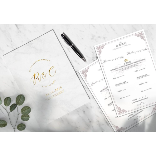 https://s-cf-tw.shopeesz.com/file/tw-11134208-7r98z-ltm7fyhy17qn22 商品:精裝裱版結婚證書夾  尺寸:29.2x20.3公分 材質:(封面) 彩色印刷 書約符合戶政事務所的規定,書約無印新人名字...等個人資訊,需自行手寫資料上去及簽名喔 說明:封面可印製新人名、婚期    下單後,請提供    1.新人名字( 如不印名字也可以更換其他文字)    2.登記日/婚期/紀念 (不確定日期建議不印) 證書夾封面會提供校稿確認,如內容有任何問題請於印製前提出,如確認定稿後無法幫您重印或修改~請知悉! 製作流程: 蝦皮下單並提供資料→排稿&確認(依校稿時間而定)→定稿→印刷(7天)→寄出 ★如有不清楚的地方歡迎用聊聊詢問喔! ⛔此商品屬 「依消費者要求所為之客製化給付」,不適用7天鑑賞期法規。 ⛔客製商品~恕不提供貨到付款服務 ★螢幕顯示與印刷成品會產生色差。(電腦螢幕,因不同品牌、型號及個別色彩設定參數,也會造成顏色觀看上的不同。 ★證書夾表面皆有上膜處理,霧膜會讓印刷品表面有霧化效果,顏色也會較沉哦。 👉如要加購證書夾周邊(雙側緞帶、書約、婚紗照等)請這邊加購 https://shopee.tw/product/149788736/6833099092/ ★辦理結婚登記時請攜帶以下文件: 1.結婚書約 2.雙方之戶口名簿 3.雙方之國民身分證/若為外籍人士需帶護照 4.新式身分證規格照片各1張 5.換領國民身分證各50元規費、戶口名簿各30元規費 ★注意: 1.結婚當事人兩位需要在登記當日親自到戶政事務所辦理,但結婚書約上簽名的兩位證人不需要到現場。 2.可以向任一戶政事務所辦理結婚登記。若需同時辦理遷入戶籍,則應選擇遷入地戶政事務所辦理。 #婚禮小物 #婚禮週邊 #簽名綢 #貼紙 #結婚書夾 #結婚證書 #結婚書約 #登記專用 #婚禮 #婚約