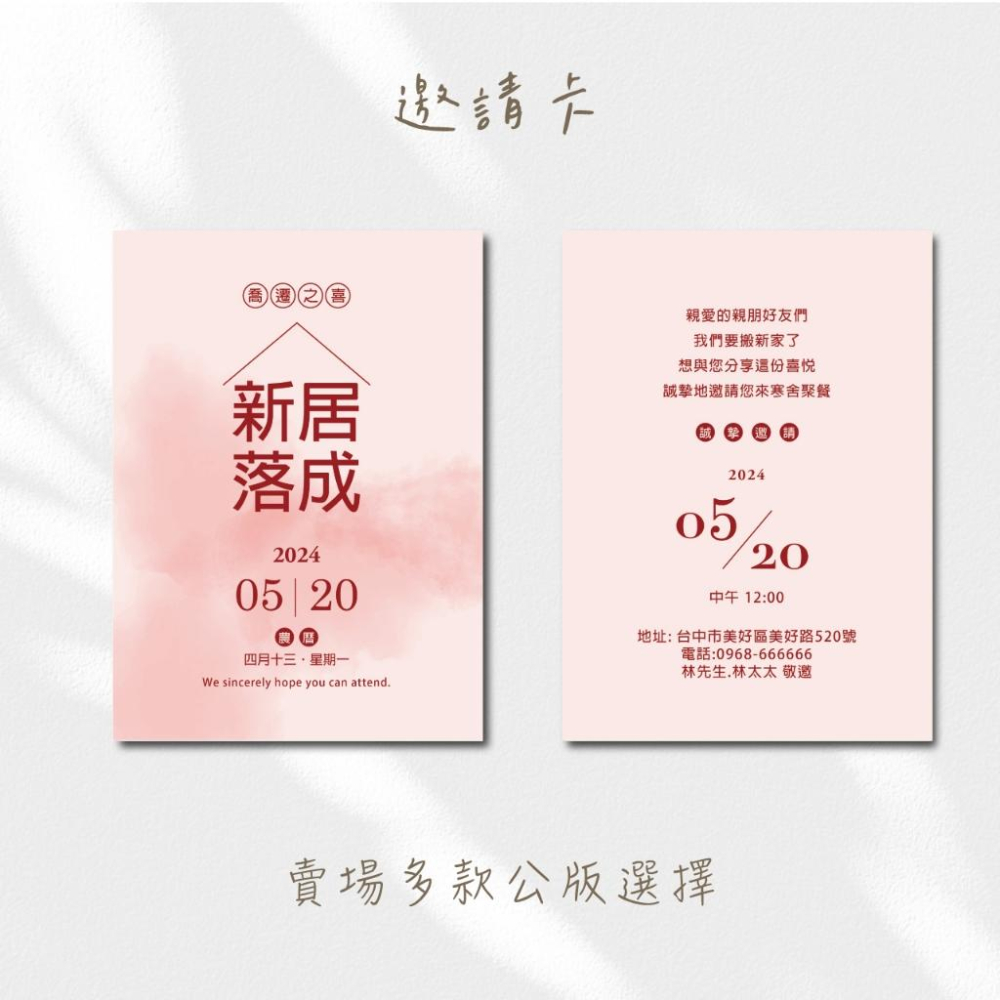 🧡入厝邀請卡 ★頁面價格為卡片單價,訂購數量以10為單位, 40張、50 張、60張 ...以此類推 ★同款式&內容為一版,不同版 數量請分開累計 ★請先確認數量與時間 再做訂購 ★預設紙材使用星幻卡(285g),如需要其他紙材可另外詢問 👉製作流程: ✦流程:挑選款式 ➔ 下單並完成付款 ➔ 傳資料 ➔ 排版 ➔ 校稿 ➔ 沒問題後再印刷 ♡ ★邀請卡資訊內容可更換成自己的內容: 宴客日期、時間、地址、電話、主人家姓名 👉訂購方式: 例如:需要數量70張,請選擇項目[ 70張(單價) ] 數量輸入 70  例如:需要數量100張,請選擇項目[ 100張(單價) ] 數量輸入 100  以此類推,系統會自動帶入總金額 賣場商品可依需求彈性搭配,可以單購卡片,或者卡片加信封,或者卡片+信封&燙金寄件人地址 👉此頁面為卡片單價 不含信封&信封燙金加工 >星幻信封請這邊訂購 https://shopee.tw/product/149788736/5019714496/ >燙金地址加工請這邊加購 https://shopee.tw/product/149788736/5242567003/ 👉卡片尺寸:11.5x16cm (單張雙面) 👉紙卡材質:(如未指定,將以星幻卡印刷) ①星幻紙卡:紙材非純白色 底色顯淡黃色光澤 印刷成品帶珠光效果 ②瑞典一級卡:一般的紙卡.但比一般紙材稍微再厚一些些 ③象牙卡:紙張平滑且紮實,色彩沈穩,印刷色彩飽和度低 ④雅紋紙:表面帶有細小的水波橫紋,質感雅緻,觸感溫柔適中 ⑤細紋紙:紙張有不規則細沙狀的壓紋,觸感特殊 ⑥亮面卡:表面非常光滑,類似相片紙質感,可防潑水、不適合書寫 📢備註: 1.每張的所有圖文皆需相同,如不同內容數量請分開累計。 2.建議您確認印刷張數,並加上備用張數後再下單,若未來追加,數量重新累計,以另一筆訂單計算。 3.定稿排印後,無法接受臨時取消或訂單與內容修改。 4.內容校對再煩請確實校對無誤,若確認過後送印才發現資訊錯誤或錯字,由買家負擔重印的費用。 5.客製商品不適用七天鑑賞期,商品送印刷後,無法取消或退貨。 ⚠️關於色差 螢幕色彩以及印刷色彩的色域並不相同,故會顯現不同的色彩。簡單來說印刷色彩顏色偏暗,油墨印不出一些特別明亮色彩,印刷也會因會紙張的不同而影響顏色。故收到印刷品與螢幕上所看到的圖稿會有所色差皆為正常的哦。 ★螢幕色彩為RGB→透過發光的螢幕色彩都比較鮮豔明亮 ★印刷則為CMYK→印刷成品會比螢幕色彩彩度偏暗一些哦! 印刷品輸出之色差值,無法以客戶之螢幕為基準。因不同紙材、每一批墨水跟印製時間,皆會影響圖型整體色彩,如對於顏色有精準的要求 請勿下單!  ⛔此商品屬 「依消費者要求所為之客製化給付」,不適用7天鑑賞期法規。 ⛔客製商品~恕不提供貨到付款服務 #新居落成 #邀請卡#雙面印刷 #入厝 #喬遷之喜#客製化卡片 #邀請卡信封 #新宅邀請卡