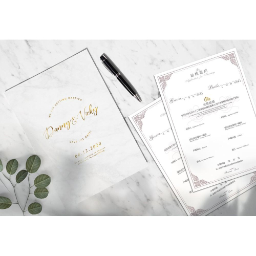 https://s-cf-tw.shopeesz.com/file/tw-11134208-7r991-ltm7fyhxzt67f4 商品:精裝裱版結婚證書夾  尺寸:29.2x20.3公分 材質:(封面) 彩色印刷 書約符合戶政事務所的規定,書約無印新人名字...等個人資訊,需自行手寫資料上去及簽名喔 說明:封面可印製新人名、婚期    下單後,請提供    1.新人名字( 如不印名字也可以更換其他文字)    2.登記日/婚期/紀念 (不確定日期建議不印) 證書夾封面會提供校稿確認,如內容有任何問題請於印製前提出,如確認定稿後無法幫您重印或修改~請知悉! 製作流程: 蝦皮下單並提供資料→排稿&確認(依校稿時間而定)→定稿→印刷(7天)→寄出 ★如有不清楚的地方歡迎用聊聊詢問喔! ⛔此商品屬 「依消費者要求所為之客製化給付」,不適用7天鑑賞期法規。 ⛔客製商品~恕不提供貨到付款服務 ★螢幕顯示與印刷成品會產生色差。(電腦螢幕,因不同品牌、型號及個別色彩設定參數,也會造成顏色觀看上的不同。 ★證書夾表面皆有上膜處理,霧膜會讓印刷品表面有霧化效果,顏色也會較沉哦。 👉如要加購證書夾周邊(雙側緞帶、書約、婚紗照等)請這邊加購 https://shopee.tw/product/149788736/6833099092/ ★辦理結婚登記時請攜帶以下文件: 1.結婚書約 2.雙方之戶口名簿 3.雙方之國民身分證/若為外籍人士需帶護照 4.新式身分證規格照片各1張 5.換領國民身分證各50元規費、戶口名簿各30元規費 ★注意: 1.結婚當事人兩位需要在登記當日親自到戶政事務所辦理,但結婚書約上簽名的兩位證人不需要到現場。 2.可以向任一戶政事務所辦理結婚登記。若需同時辦理遷入戶籍,則應選擇遷入地戶政事務所辦理。 #婚禮小物 #婚禮週邊 #簽名綢 #貼紙 #結婚書夾 #結婚證書 #結婚書約 #登記專用 #婚禮 #婚約