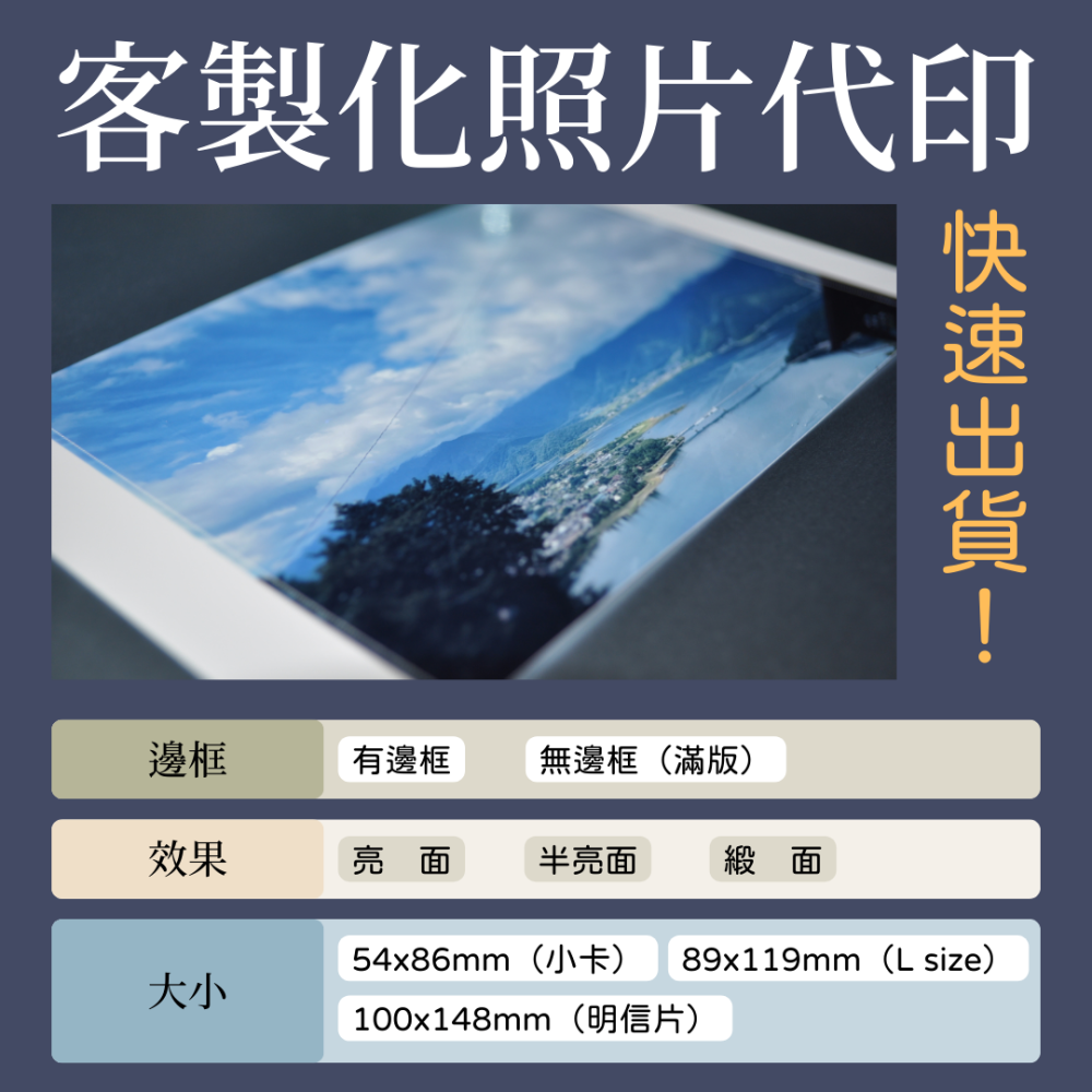 我們提供客製化照片代印 服務,您可以選擇以下尺寸:
