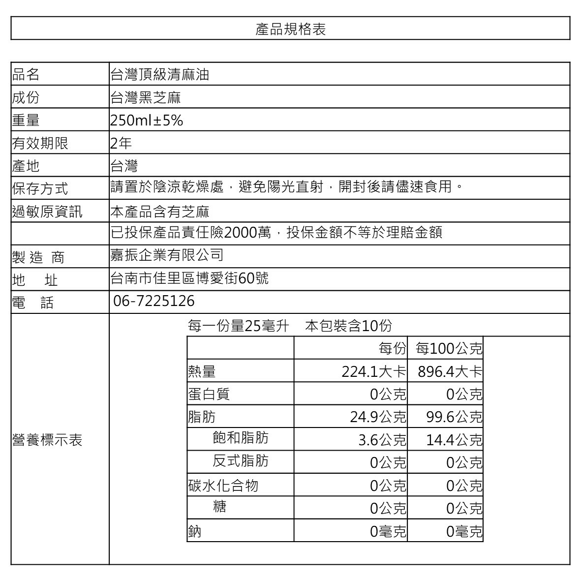嚴選台灣本土黑芝麻粒,經低溫焙炒壓榨,保留新鮮芝麻獨特的香味,純100%芝麻油,含較高的亞麻油酸( Omega-3),低溫焙炒不燥熱,適合一般煎、煮、炒、涼拌等用途。本公司通過ISO22000‧HACCP驗證,產品己投保2000萬責任險。