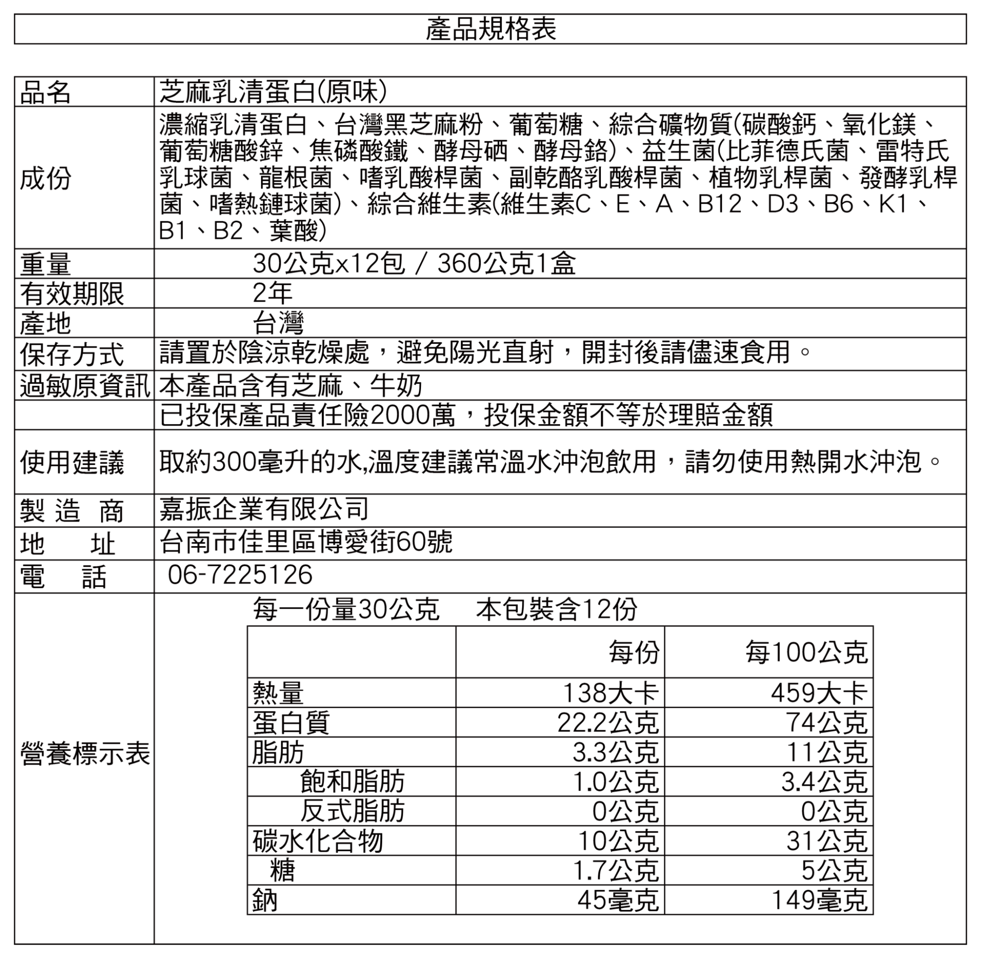 品名: 芝麻乳清蛋白(原味)