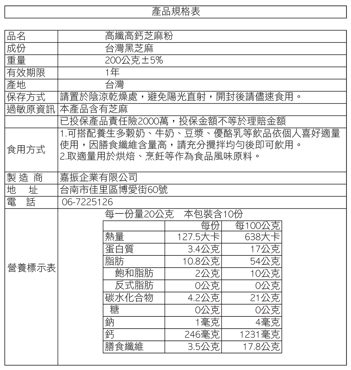品名: 高纖高鈣養生芝麻粉