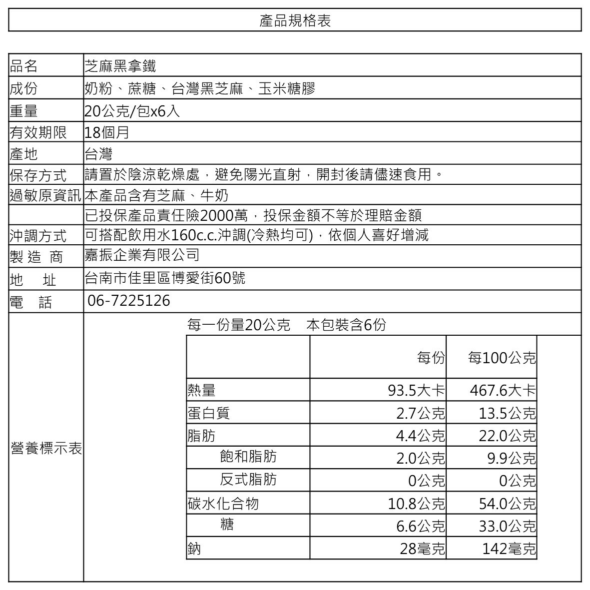 成分: 奶粉、蔗糖、臺灣黑芝麻、玉米糖膠、維生素E、牛奶鈣