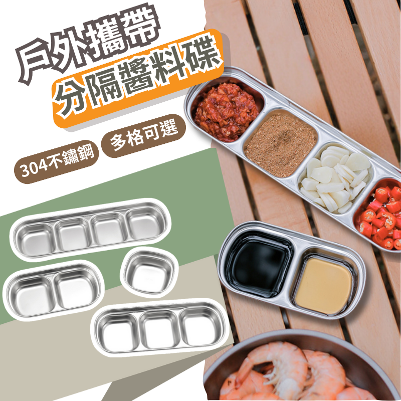 🏕️ 特色:共有四款分隔醬料碟,一次可享用到不同沾醬帶來的美食享受,全碟不鏽鋼材質,耐腐蝕不易生鏽,加深食物槽不易滑出碟,工藝細膩,可堆疊收納,攜帶方便,整潔不佔空間。