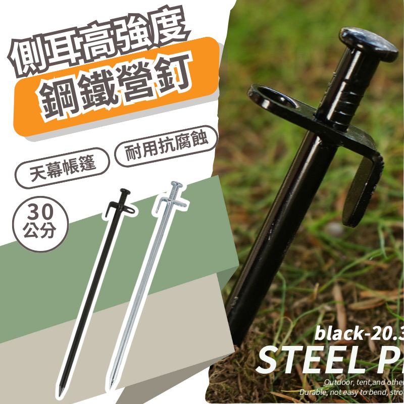 🏕️ 特色:30CM鋼鐵製營釘帶有側耳設計,可防止營繩脫鉤以及增添各種固定營繩的方式,讓你更加靈活運用,鋼鐵製更加耐用防腐蝕,不僅用於帳篷固定也可以用於天幕固定。