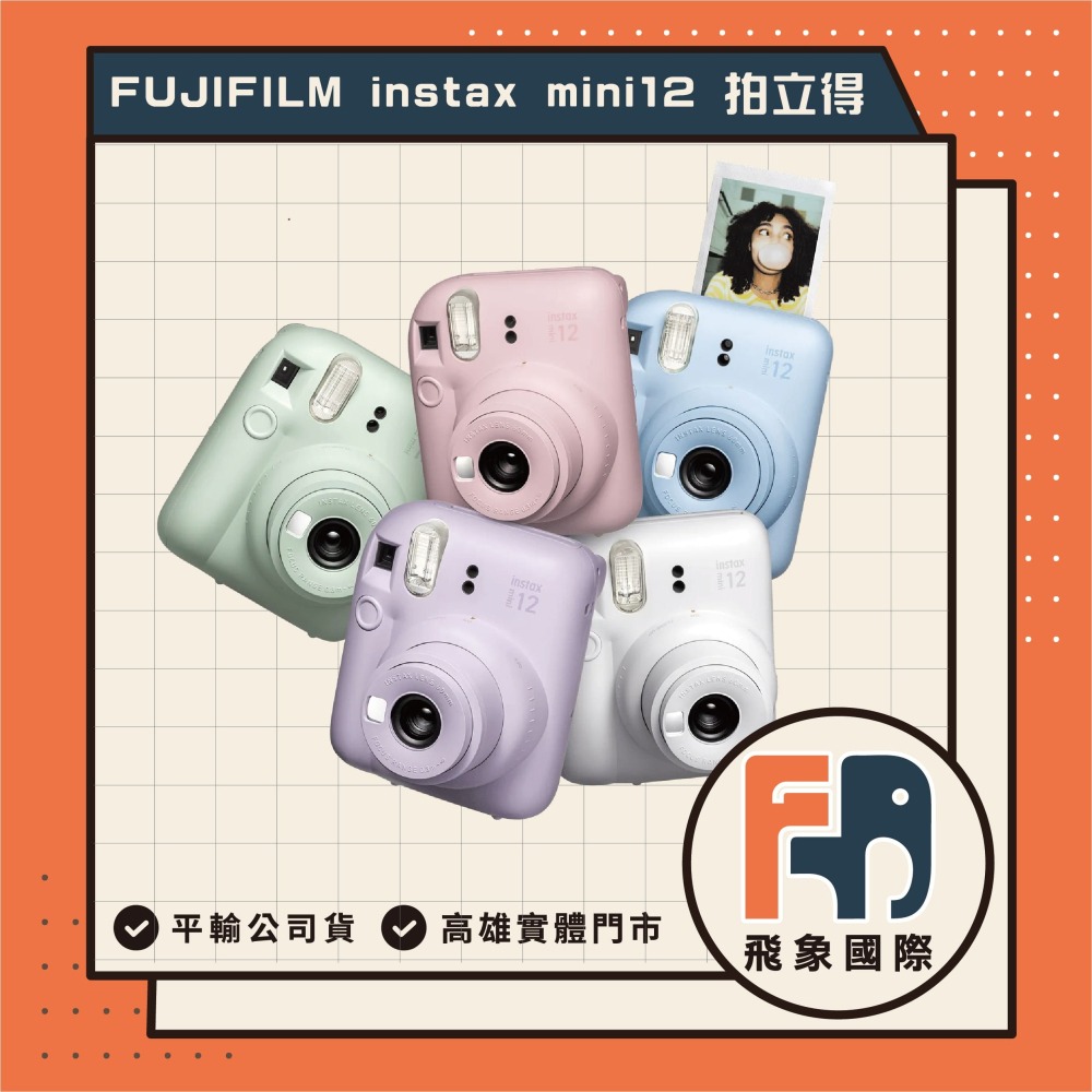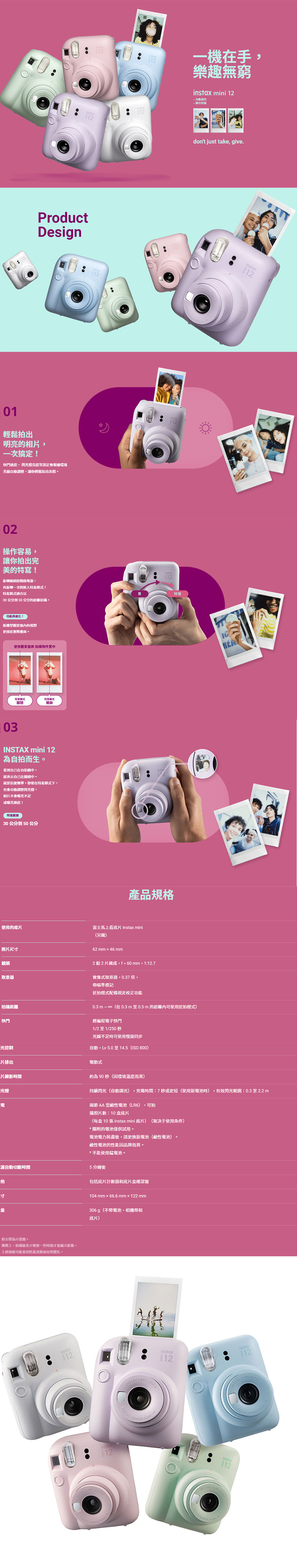 instax mini12 相機 x1、相機背帶 x1、AA 鹼性電池(測試用) x2、使用說明書 x1