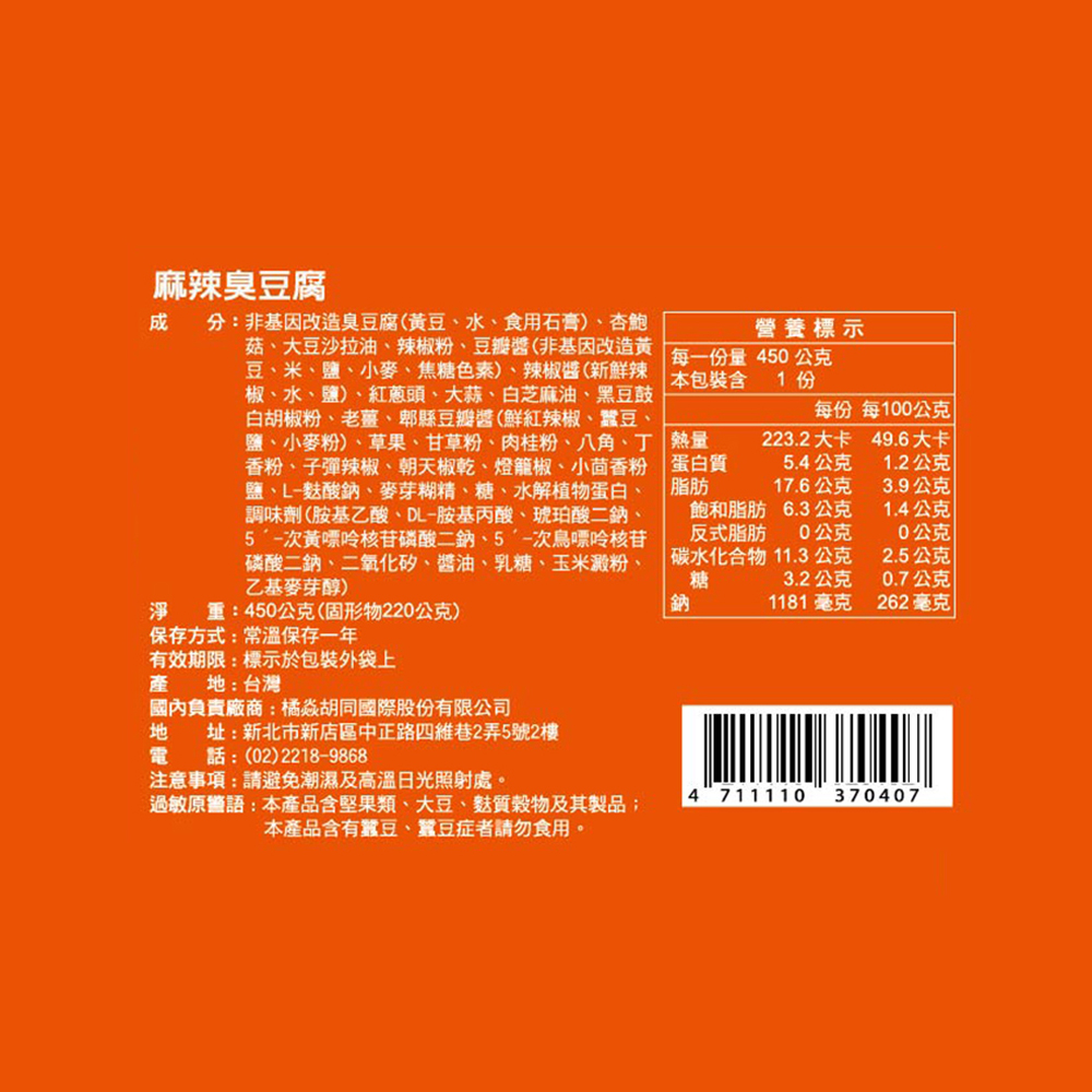 🔸成分:非基因改造臭豆腐(黄豆、水、食用石膏、杏鮑菇、大豆沙拉油、辣椒粉、豆瓣醬非基因改造黃豆、米、鹽、小麥、焦糖色素、辣椒醬新鮮辣椒、水、鹽、紅蔥頭、大蒜、白芝麻油、黑豆鼓)白胡椒粉、老、縣豆瓣醬鮮紅辣椒、蠶豆、鹽、小麥粉、草果、甘草粉、肉桂粉、八角、丁香粉、子彈椒、朝天椒乾、燈籠椒、小茴香粉鹽、L酸鈉、麥芽糊精、糖、水解植物蛋白、調味劑胺基乙酸、DL胺基丙酸、琥珀酸二鈉5次黃哈核磷酸二鈉、5“次鳥嘌哈核昔磷酸二鈉、二氧化矽、醬油、乳糖、玉米澱粉、乙基麥芽醇