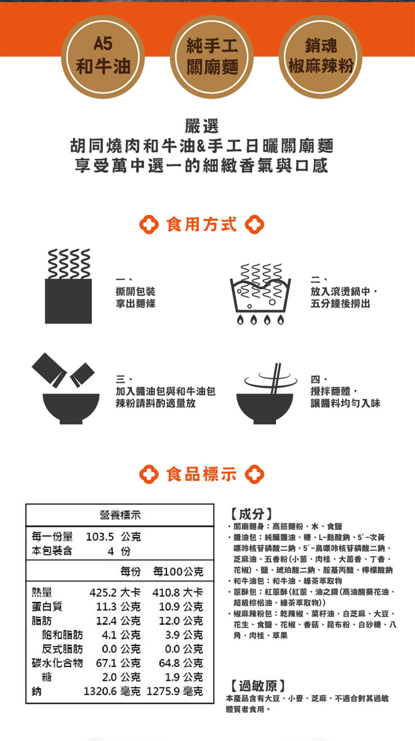 嚴選胡同燒肉A5和牛油,享受萬中選一的細緻和牛油香與美味;純手工製作日曬關廟麵,無添加防腐劑、無人工色素、無麵質改良劑。銷魂的牛油香氣四溢,每一口麵都是滿滿的胡同味,也是幸福的滋味。