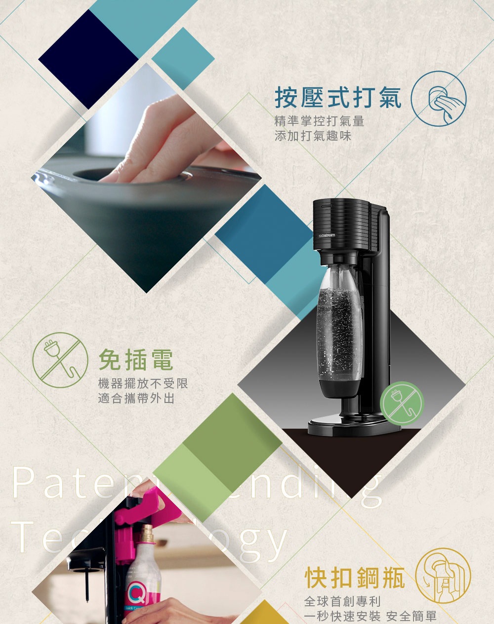 ★ 免插電,旋入水瓶按壓即可享用完美比例氣泡水