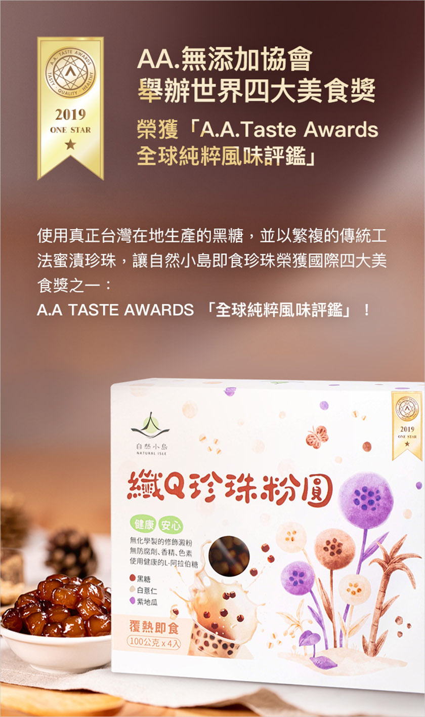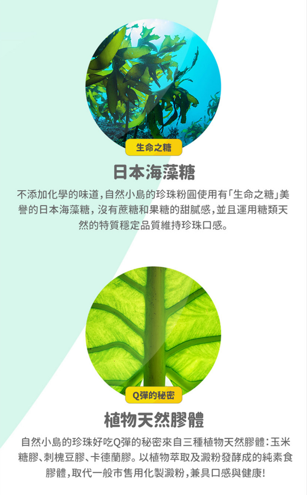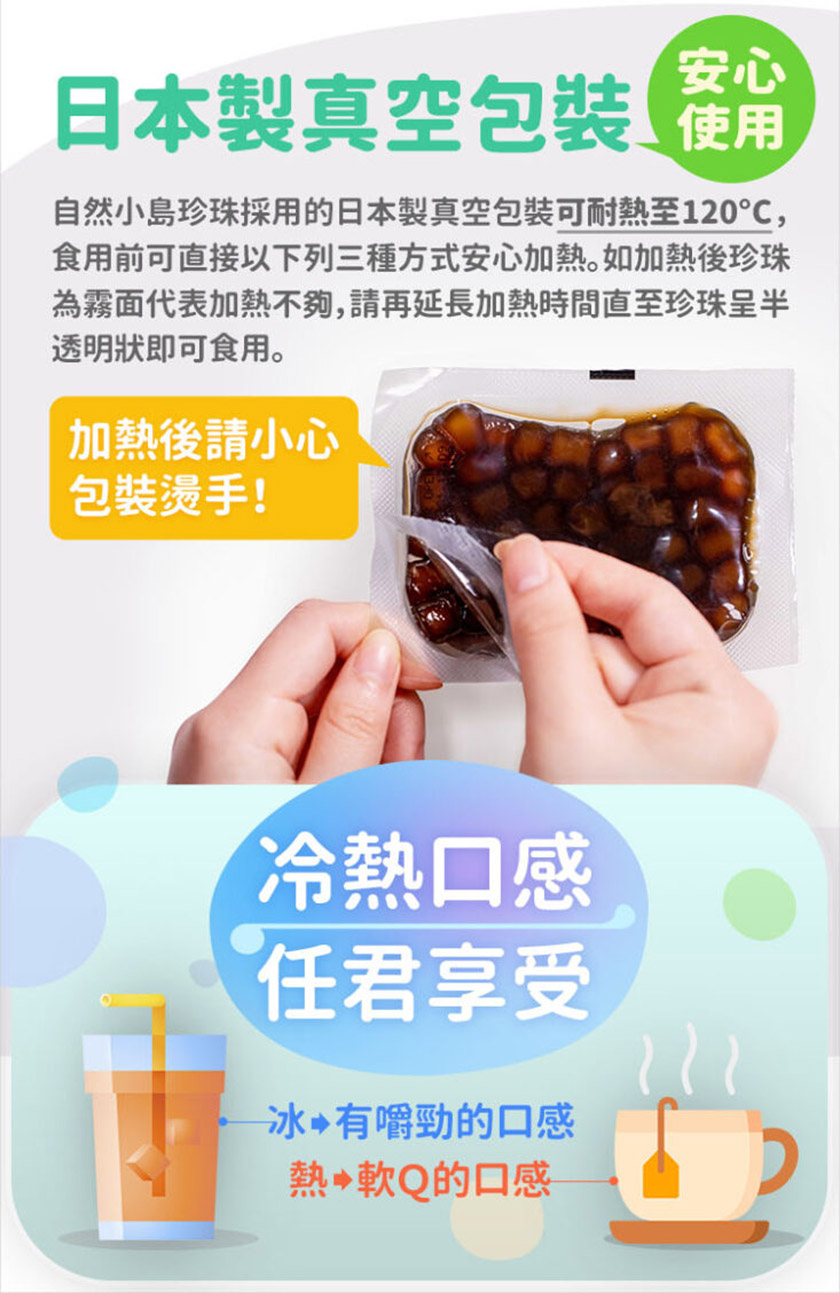 自然小島纖Q即食珍珠以天然食材製作珍珠粉圓、成分簡單,無化學添加、無色素,安心食用無負擔。
