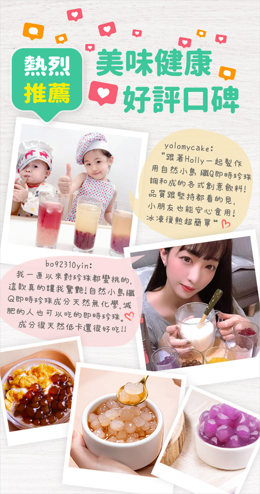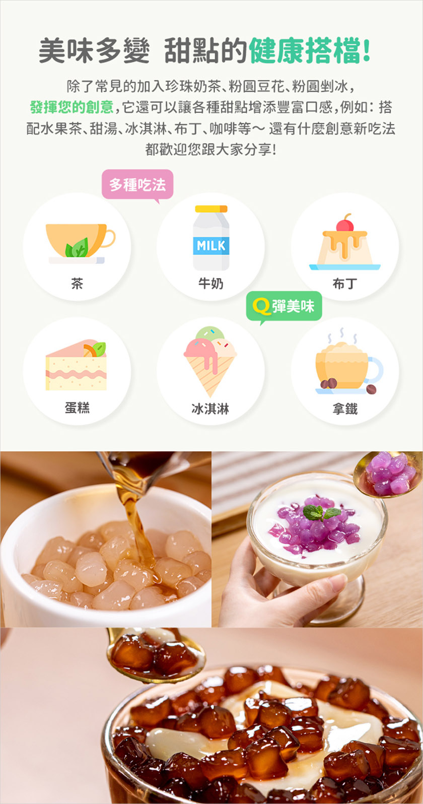 多種口味:原礦黑糖蜜、蜂蜜、白玉、黑糖,讓天天都能吃到不同新口味的好吃珍珠!