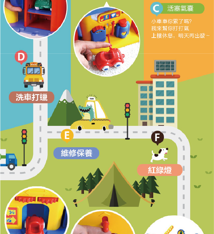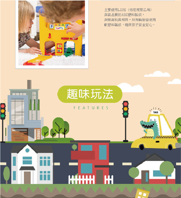 有別於市面上他牌的停車場玩具,獨特的人車分道設計,玩樂中學習交通規則及交通安全(內附交通號誌配件)