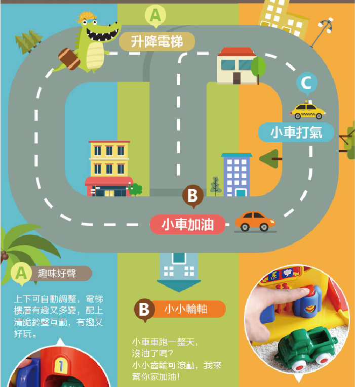 讓孩子用他們純真的想像力,在這個色彩繽紛的三層停車場裡馳騁孩子心中的車子遊樂場夢想!