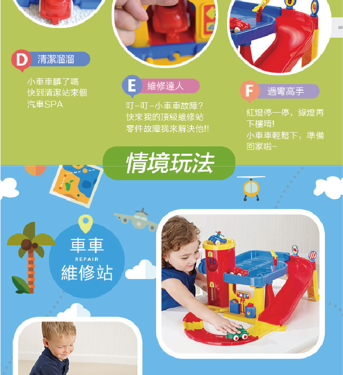 停車場內還包含了洗車中心/汽車維修中心/加油站,互動式的車車專用升降梯,可愛的直升機停機坪