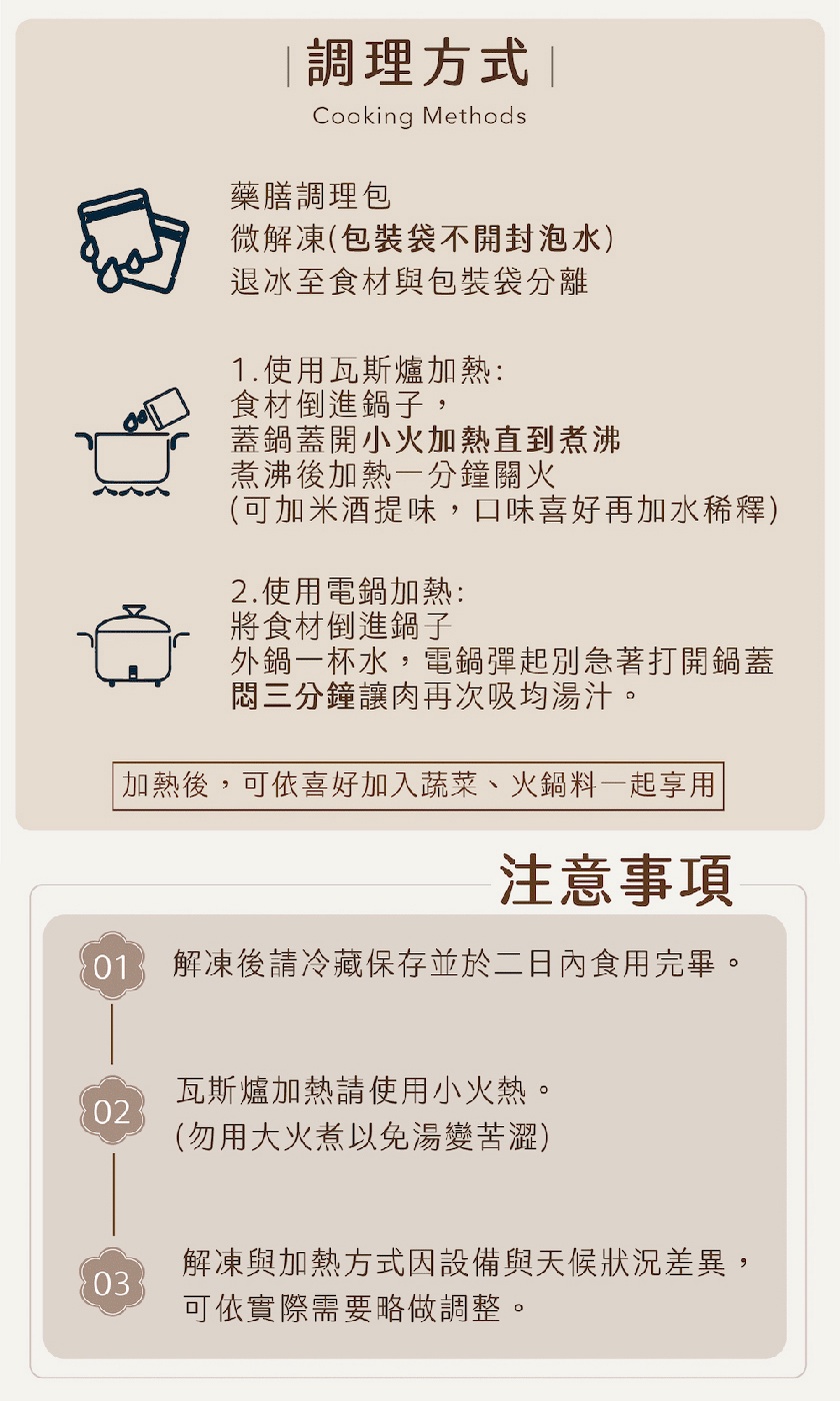 🔸主要成分:豬肉、枸杞、紅棗、當歸、黃耆、辛香料